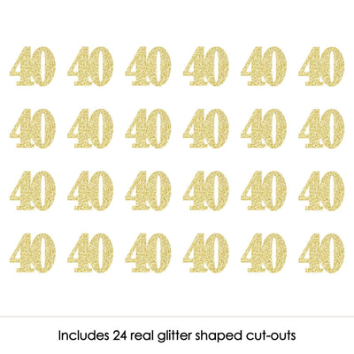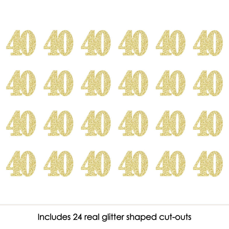 Gold Glitter 40s are the perfect way to bring all your DIY party ideas to life. Each set of no-mess real gold glitter cut-out numbers includes 24 paper embellishments. Scatter number 40 cut outs down the length of your party tables or adhere to party favor bags for adorable birthday party or anniversary party decorations. Each Gold Glitter 40 has a no-mess glitter front and a white paper back, making them easy to attach to a variety of items. The real gold glitter numbers will add a little extra glimmer to all your party décor!