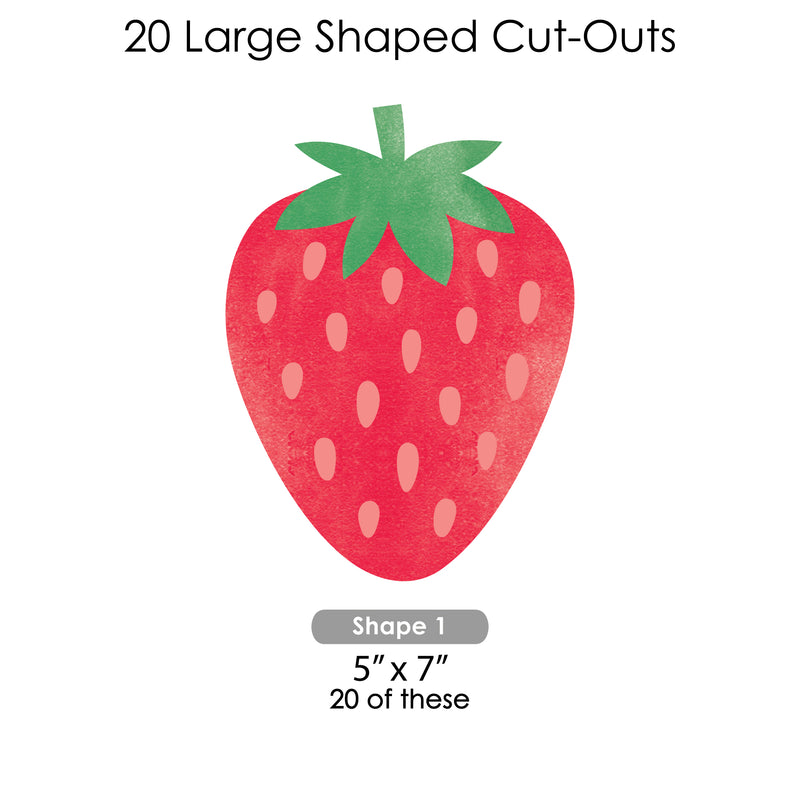 Easily decorate your Fruit Themed Birthday Party or Baby Shower with Berry Sweet Strawberry clothespin garland banner. This DIY banner kit includes 44-pieces of Berry Sweet Strawberry paper cut-outs, 50 mini clothespins, and white cord. Before hanging, plan out your desired pattern by alternating in sizes. Using a miniature clothespin, clip shapes on the included cord. Hang finished DIY garland banner at the entrance of your party, over mantelpiece, along buffet tables, or as high chair banner decoration. After the party, reuse the clothespins and cord to hang event photos as a fun keepsake. Berry Sweet Strawberry large cut-outs are professionally printed double-sided, small cut-outs are professionally printed with coordinating pattern on back, and all on sturdy cardstock paper with a photo-like shine.