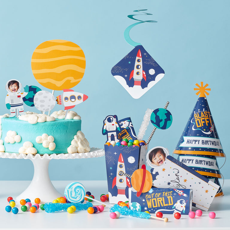 Throw a stellar party for your astronaut in training with Blast Off to Outer Space rocket ship theme party decorations.
