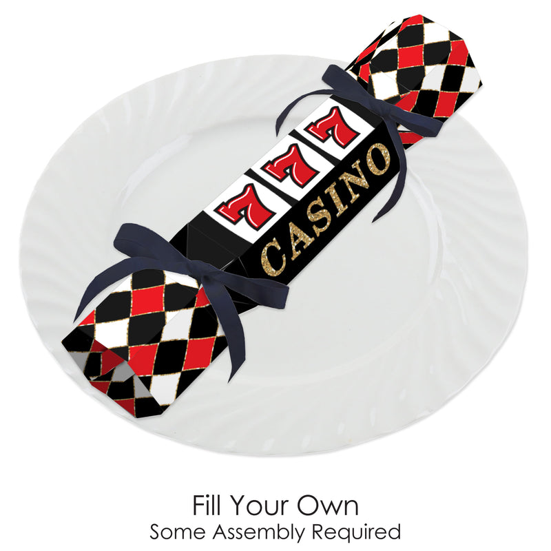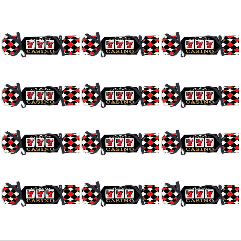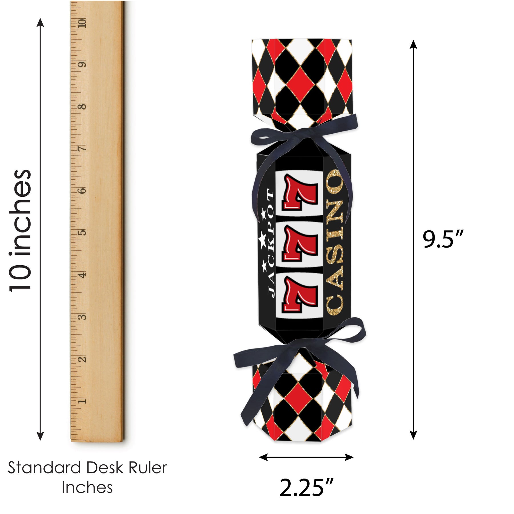 Make your Prom, Birthday or Casino Retirement Party unforgettable when you present your guests with the fun and playful no-snap Las Vegas Cracker Boxes. Coming in a set of 12, these DIY candy-shaped favor boxes include coordinating satin ribbon and are perfect for holding small treats and gifts! Get started assembling Las Vegas party crackers by gently squeezing along the creased line to form the hexagonal shape. Tightly tie a ribbon around the bottom section of cutout diamonds and then begin filling your box with your party goodies. Finish it off by tying a ribbon around the top section, which will give you the final candy-like shape. Las Vegas DIY non-snap cracker boxes are professionally printed double-sided on heavy-duty cardstock paper with a photo-like shine and measure to be 2.25” wide by 9.5” tall when assembled. Use them as party table decorations or hand them to your guests as take-home party favors! Add some extra cheer to your celebration when you use the Las Vegas Cracker Boxes at your celebration!