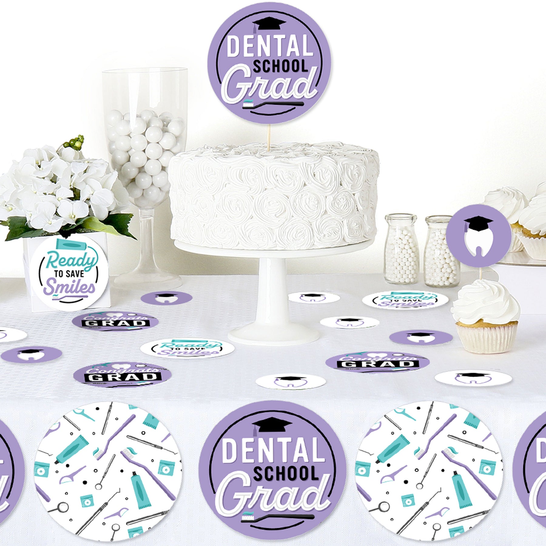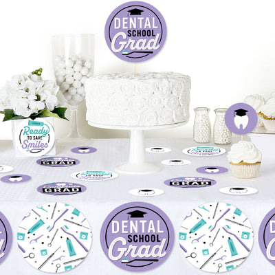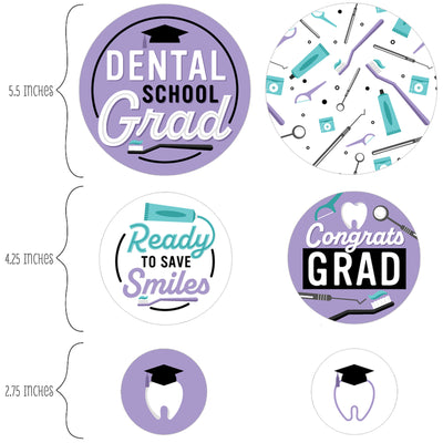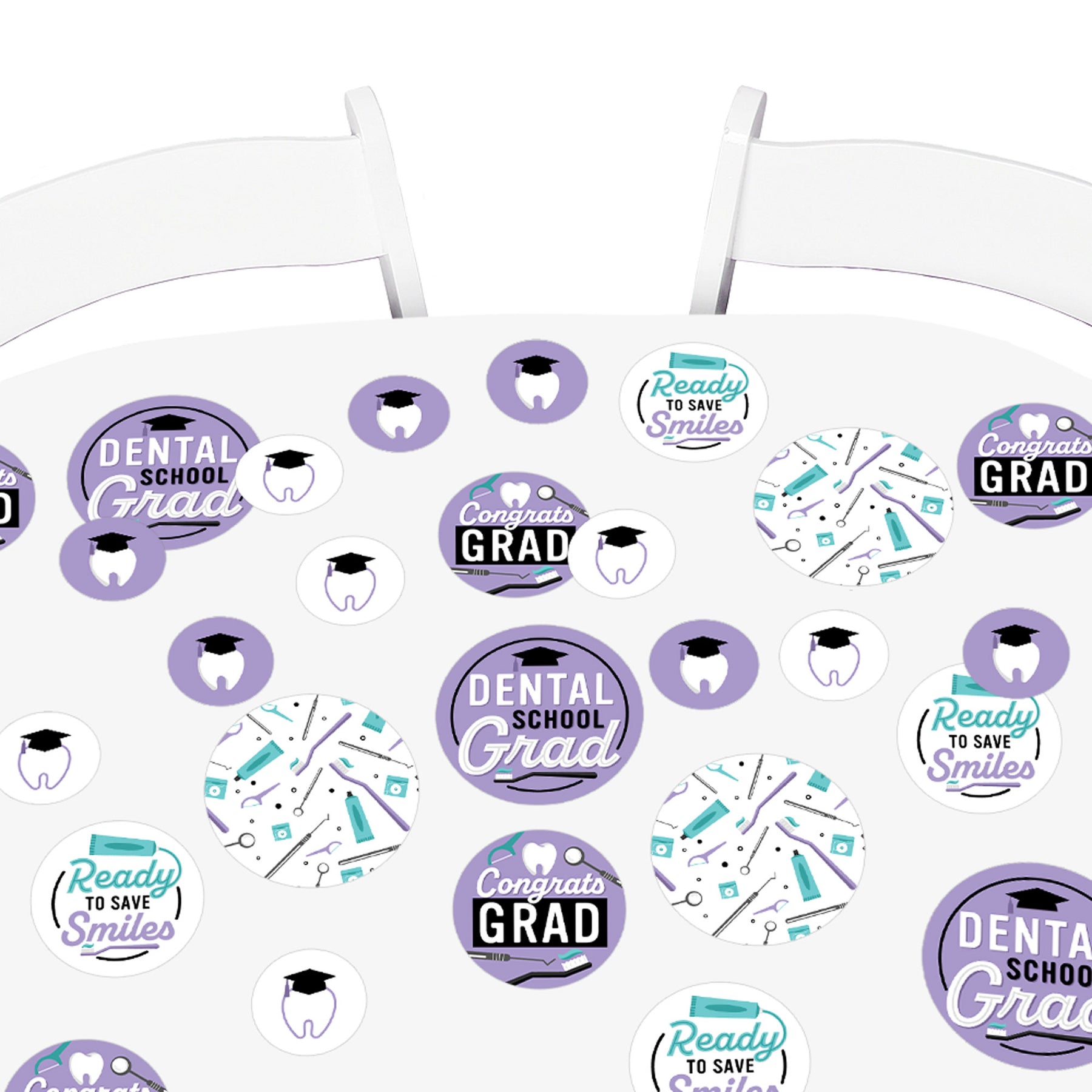 This Kit Includes 27 Confetti Pieces: 6 -5.5" party circles with Dental School Grad art 9 -4.25" party circles with Dental School Grad art 12 -2.75" party circles with Dental School Grad art