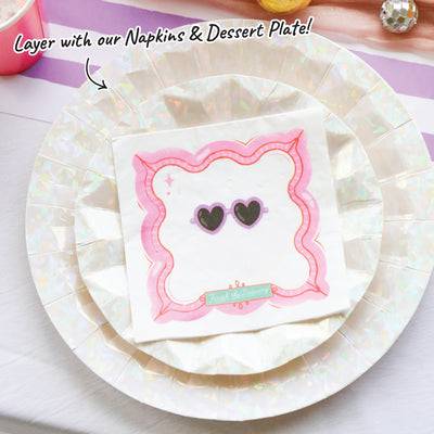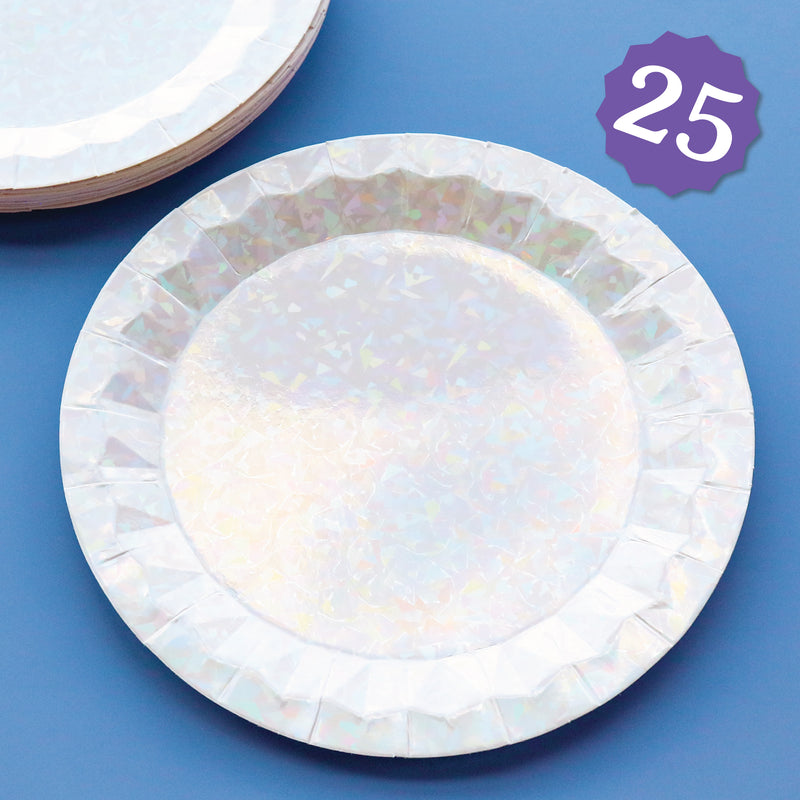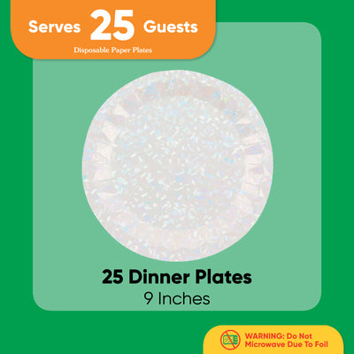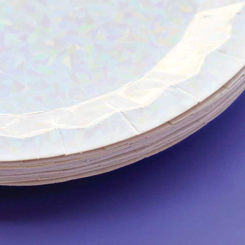 Get ready to serve up major vibes at your next party with these Iridescent White Dinner Plates! Perfectly sized at 9 inches round, these party plates are ready to bring a dreamy, modern twist to any event. With their holographic shimmer, they make a stunning base for layering with other plates & napkins or popping against your table decor. Best of all, they're disposable, which means no scrubbing at the sink and yes to breezy cleanup! Party tip: Pair them with metallic accents and a curated playlist to make your dinner party totally Instagram-worthy. Whether it’s a holiday bash or a kids birthday party with friends, these plates will keep things fun and stylish.