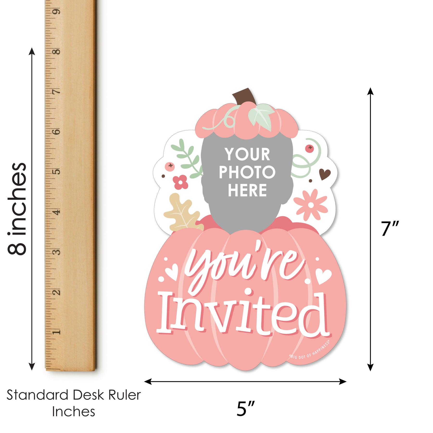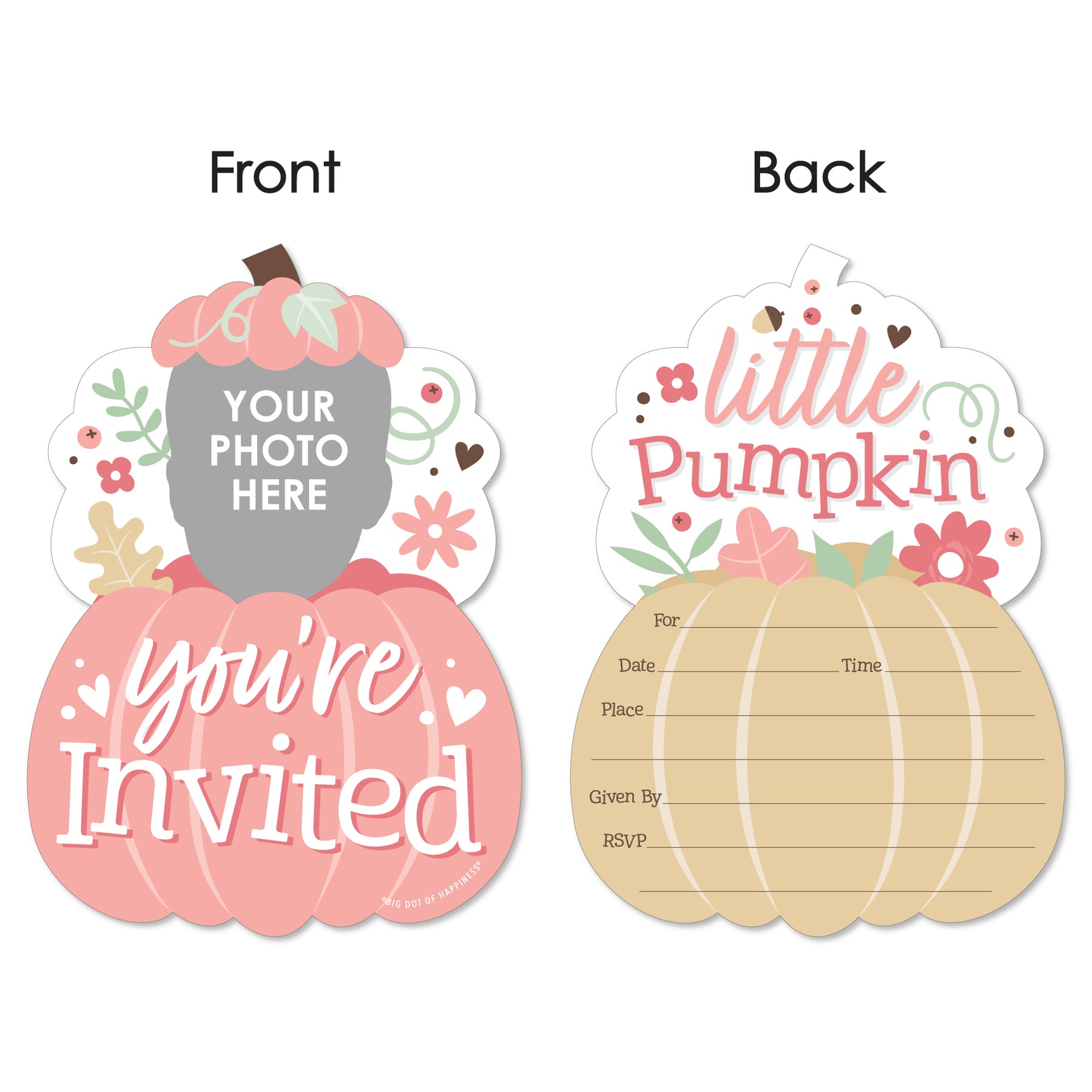 Build excitement for your upcoming Fall Birthday Party with the Girl Little Pumpkin Fun Face Shaped Invites! These fun and quirky invitation cards come in a set of 12 with white envelopes included and will feature ONE custom picture face cut-out. Professionally printed double-sided on high-quality cardstock paper, the Pumpkin cards come with a photo-like shine on the front and a matte finish on the back, making it easy to handwrite all your party information. Enclose the invites in an envelope and then you can either hand-deliver the invitations or send the invites via snail mail. Your recipients will be delighted when they receive their Girl Little Pumpkin party stationery and can also keep the invite card as a fun photo keepsake! Make your celebration extra special when you prepare for your party with the Pastel Pumpkin custom photo invitation set!