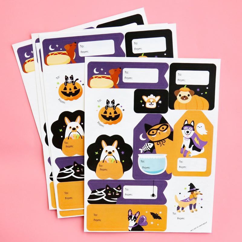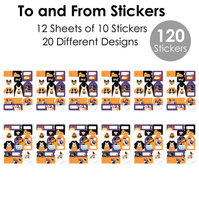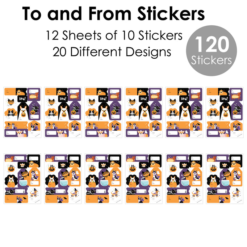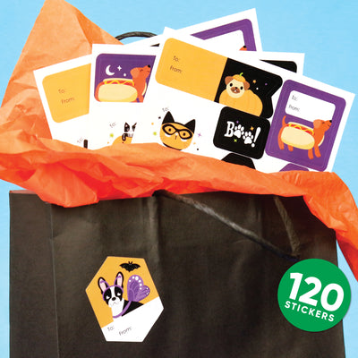 Take your gift-giving to another level when you use the Halloween Pets To and From Stickers to personalize each gift. Perfect for a Kids Halloween Party or classroom celebration, the assorted stickers will add an extra charm to your present and will have your recipient eager to see what’s inside. To use, simply write in the To/From section of the gift label sticker. Then, peel and stick onto the surface of the gift! Professionally printed on high-quality sticker paper, each Halloween Pets sticker set comes with 20 different designs and 12 sheets of 10 stickers for a total of 120 stickers altogether. Each sheet measures 5.75 in wide x 7.75 in tall. Adorable and practical, the Spooky Cat & Dog Halloween gift tag labels are eye-catching and easy to write on. For a quick and easy solution, the Halloween Pets To and From Stickers are a perfect way to personalize any present - big or small.