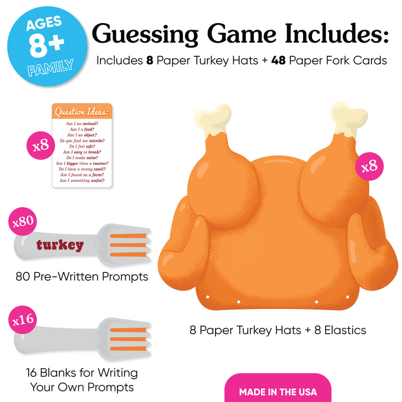 Make your Thanksgiving gatherings even more memorable with this hilarious and customizable Turkey Guessing Game! This family-friendly game is easy to play and perfect for Thanksgiving dinner, Friendsgiving, classroom activities, or even retirement home gatherings. Each player wears a turkey hat and asks yes/no questions to figure out their prompt—guaranteed to bring laughs to the table. Want to up the fun? Use the 16 blank forks to write your own quirky prompts—whether it’s an inside joke, a funny family reference, or a super challenging clue, the personalization options are endless. Get ready to gobble up some giggles this holiday season!