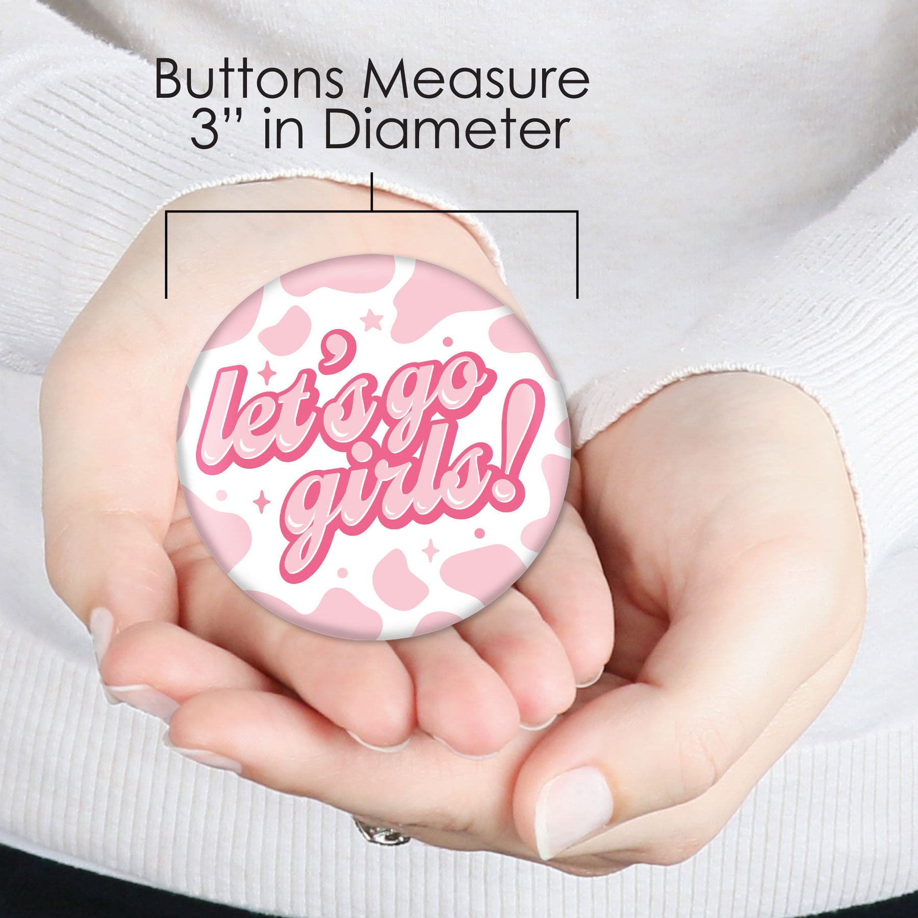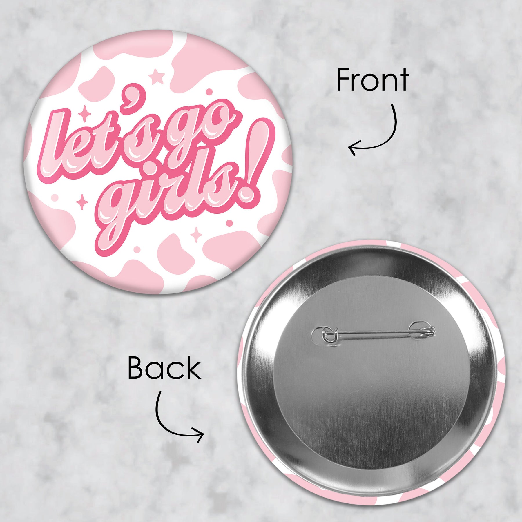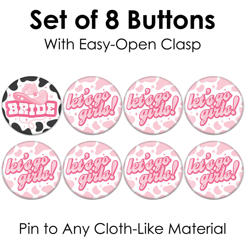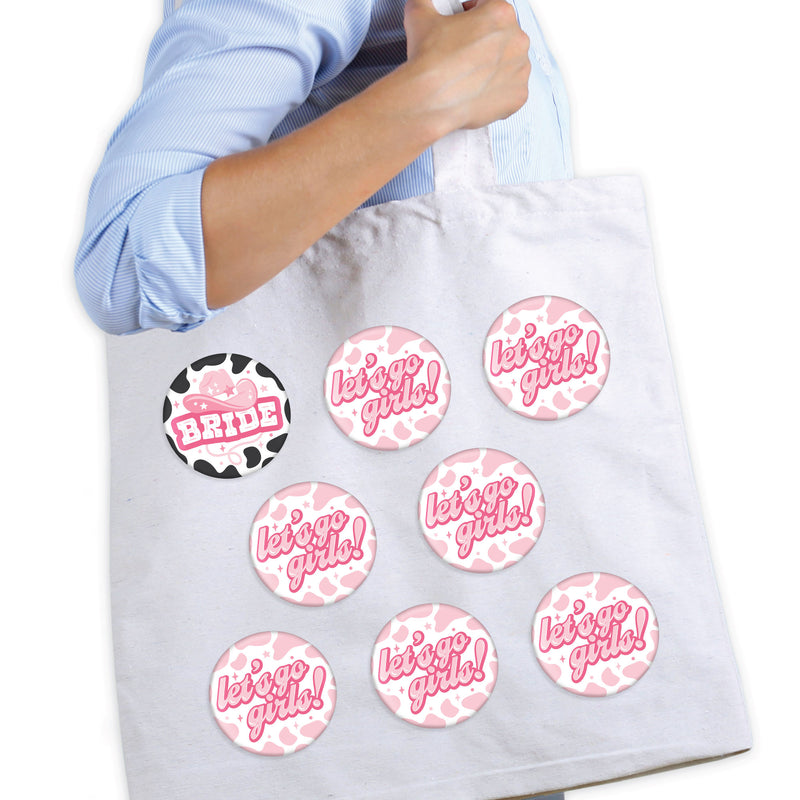 Make your party favors an eyecatcher when you hand out Last Rodeo Pinback Buttons to your favorite group! Designed to be trendy and easy to use, these original Bachelorette Party badges will be a hit at your next Pink Cowgirl Bachelorette Party. Buttons can be pinned onto any cloth-like materials such as shirts, carry bags, and sashes and come fully assembled in set of 8. If thinking outside the box is your thing, use ribbon to tie your buttons onto gifts. You can even turn them into magnets with a little glue and magnet strips. No matter how you use your Last Rodeo badges, you’ll be sure to make a statement … without the hassle.