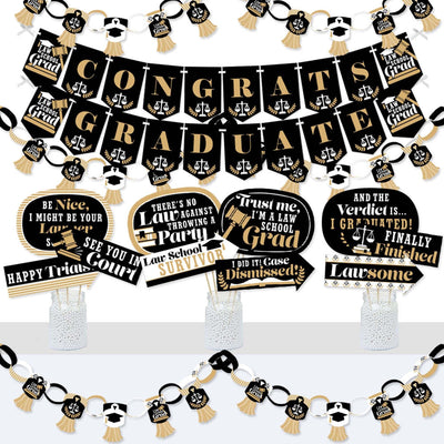 There’s no law against throwing a party! Celebrate the future lawyer with a Law School Grad Party. This collection of Law School Graduation decorations features black and tan graduation party supplies perfect for any size party. First, send Law School Graduation invites to family and friends and then use the welcome yard sign to greet the guests on the day of the party. Next stop, the bar! Use Law School Grad beverage bar labels to coordinate your drinks to the favors and decorations. Any future lawyer deserves a cake for surviving law school; decorate the cake with Law School Grad cake topper for that extra-special touch. And the verdict is…honor the graduate with our Law School Grad party theme.