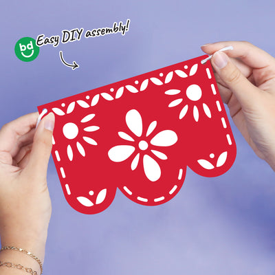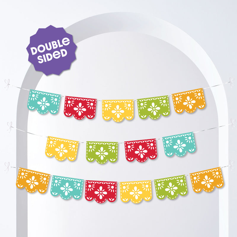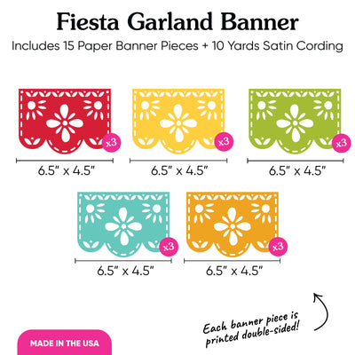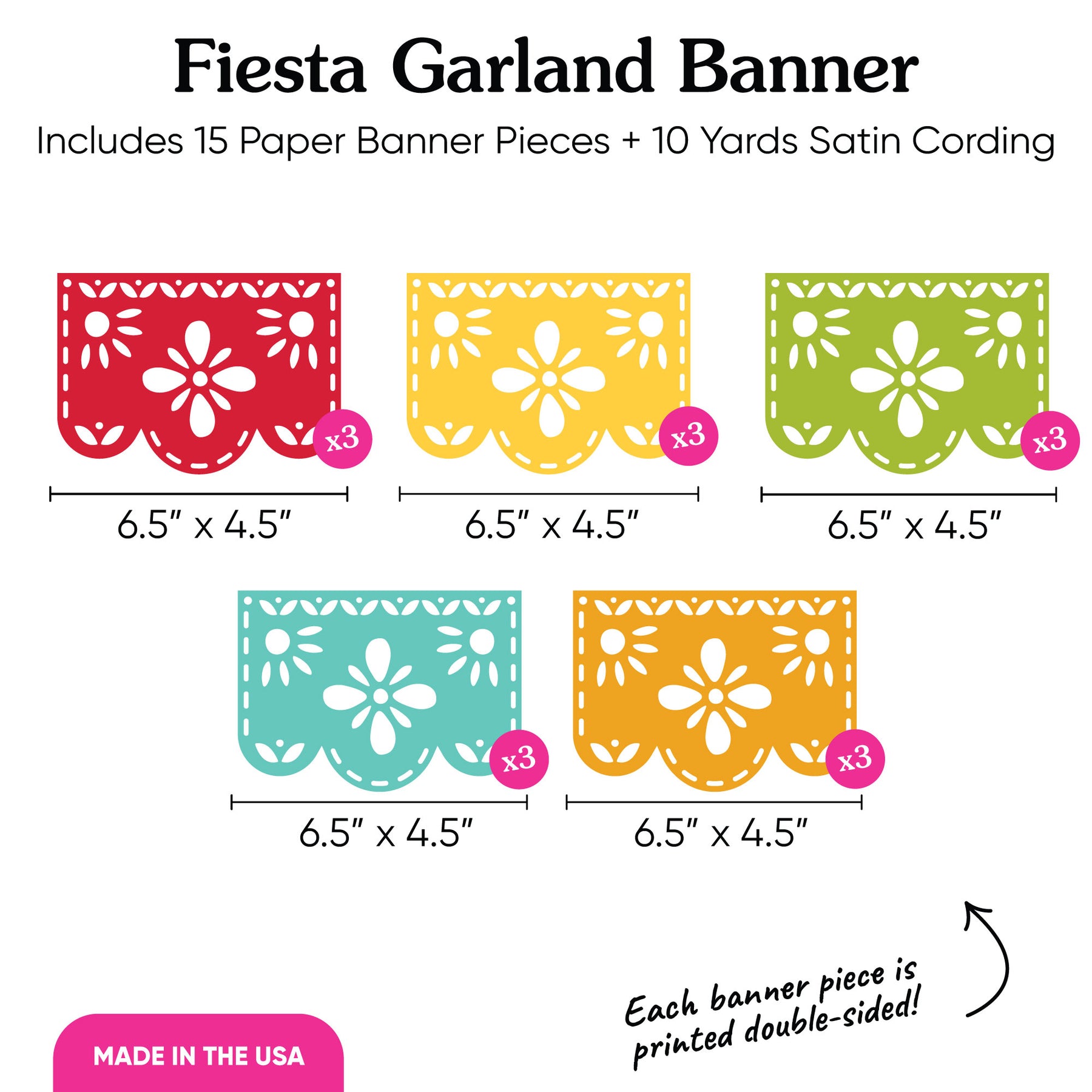 Spice up your celebration with our fiesta-themed garland banner! This vibrant decoration brings the fun with bright colors and festive flair, making every party feel like a fiesta. Designed for double-sided impact, it pops from every angle and comes with 15 feet of white cording for easy setup.