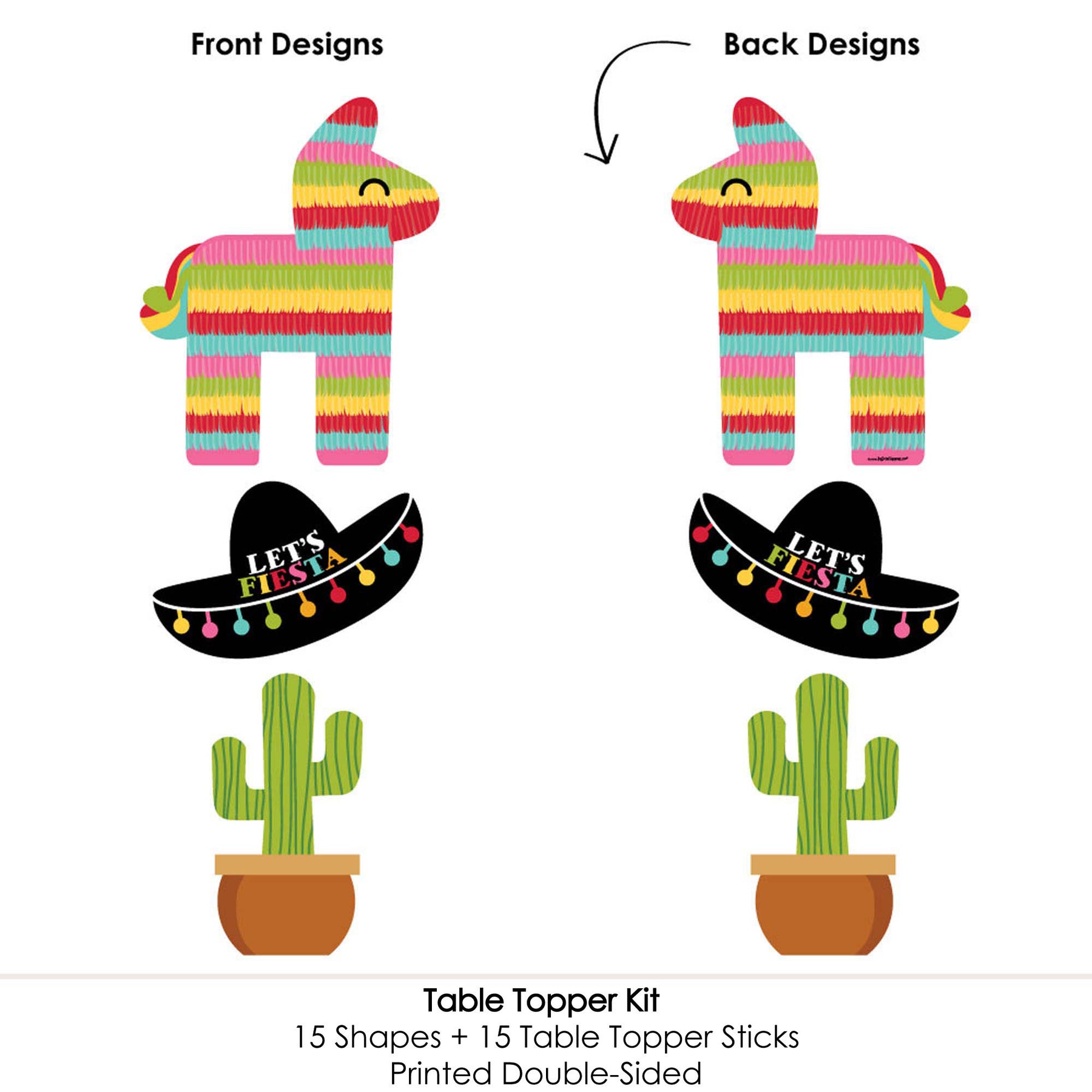 Bring your Mexican Fiesta Party theme to all areas of the celebration with Let's Fiesta Table Toppers. Each heavy-duty cardstock paper cutout quickly attaches to the included table topper sticks to create centerpiece sticks that can be used in vases or floral arrangements at all your party tables. You can even add them to candy jars at your goodie table! Let's Fiesta centerpiece sticks may also be used as photo booth props. You will love how versatile this fun party supply is while your guests will adore seeing them throughout your party venue. Get creative with this set of 15 table toppers and have a truly YOU-nique celebration.
