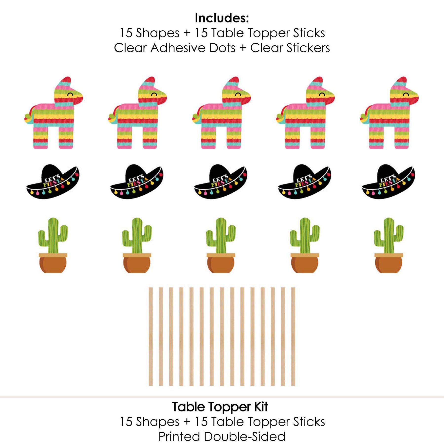 Includes 15 Shaped Table Toppers, 15 table topper sticks and Assembly Stickers