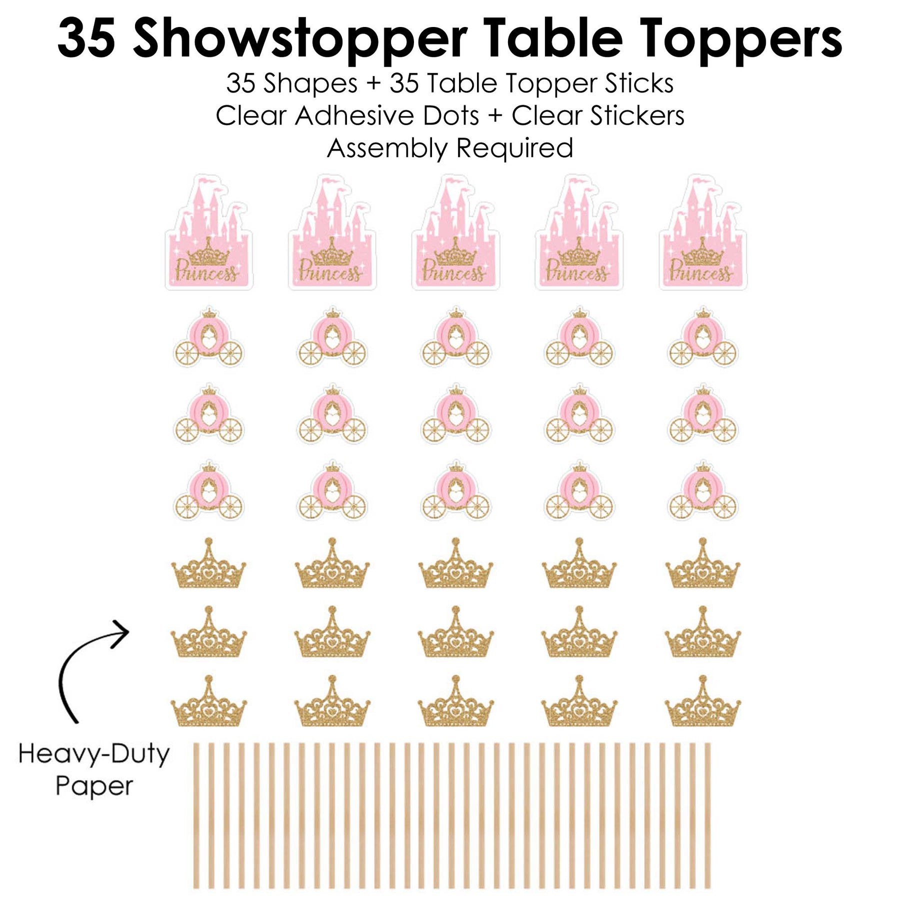 Whether hosting a large group celebration with multiple tables or inviting your closest friends over for a Little Princess Crown - Pink and Gold Princess Baby Shower or Birthday Party, create easy DIY party centerpieces with our 35-piece showstopper table toppers. Little Princess Crown table topper cut-outs are professionally printed double-sided on sturdy cardstock paper with a photo-like shine and include 35 table topper sticks and clear stickers for at home assembly. Add assembled centerpiece sticks to floral vases, candy jars, or any sturdy container to place in the center of dining tables, at candy buffets, or the party's welcome entrance.