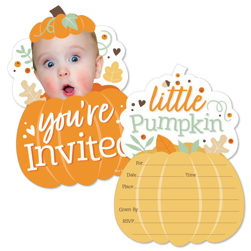 Build excitement for your upcoming Fall Birthday Party with the Little Pumpkin Fun Face Shaped Invites! These fun and quirky invitation cards come in a set of 12 with white envelopes included and will feature ONE custom picture face cut-out. Professionally printed double-sided on high-quality cardstock paper, the Pumpkin cards come with a photo-like shine on the front and a matte finish on the back, making it easy to handwrite all your party information. Enclose the invites in an envelope and then you can either hand-deliver the invitations or send the invites via snail mail. Your recipients will be delighted when they receive their Little Pumpkin party stationery and can also keep the invite card as a fun photo keepsake! Make your celebration extra special when you prepare for your party with the Fall Pumpkin custom photo invitation set!