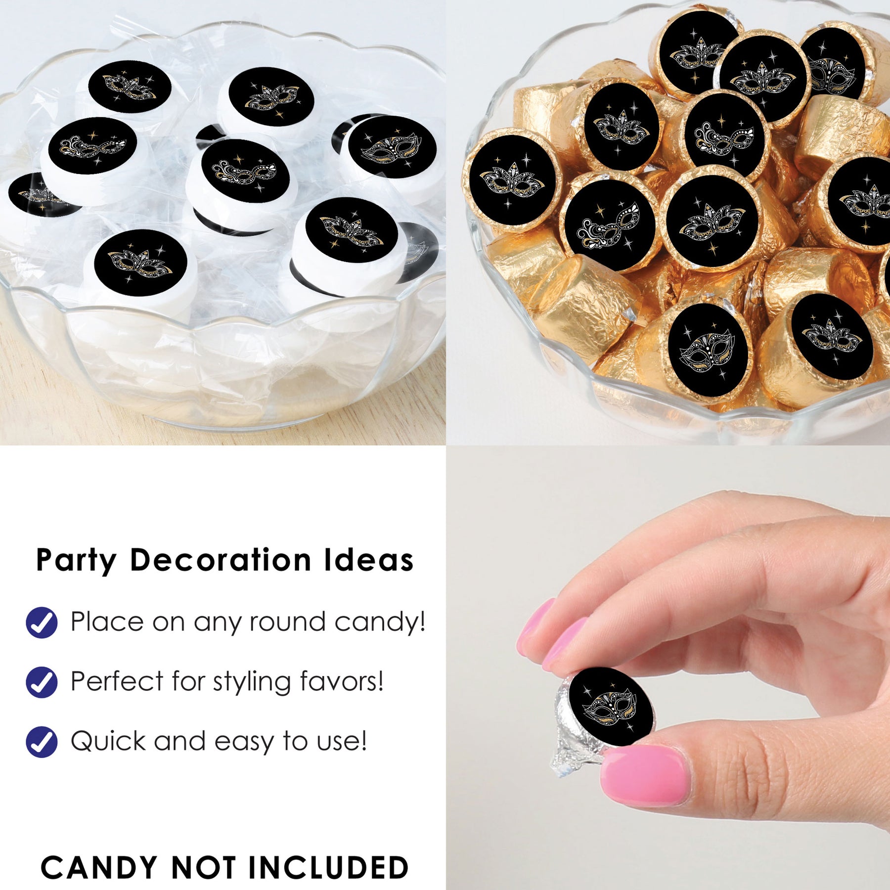 Make your treats a little more special when you adorn them with the Masquerade round candy stickers. These delightful stickers come out to be about .75 inches and really help to elevate the attention to detail for your Venetian Mask Party. With 4 coordinating designs and 324 stickers total, using these mask night labels is effortless. Simply peel and stick them onto your favorite round bite-sized candies like wrapped chocolates and mints. Use the stickered candies as decoration on your fabulous table setup or give them out to guests as party favors. Consider using the Masquerade round stickers on bottled beverages or party stationery. The creativity is endless! Without a doubt, the venetian round candy stickers are the perfect touch that will make your party an unforgettable event.