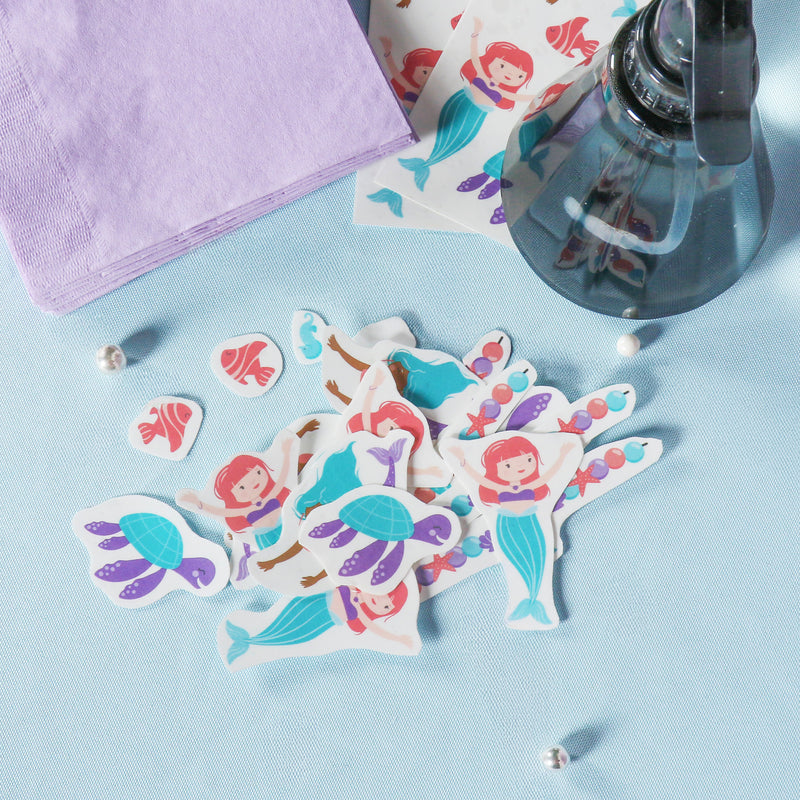 Dive into a sea of fun with our Mermaid Temporary Tattoos! This set includes 12 pre-cut sheets of stunning mermaid designs, perfect for kids who love the ocean. These colorful tattoos make great party favors or a fun tattoo station at your celebration.