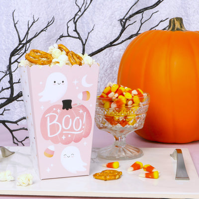 Each Pastel Halloween popcorn box shows off the vivid colors of this Cute Spooky Pink Pumpkin Party theme. The fun patterns will look great next to the rest of your party supplies. Display filled popcorn boxes at your candy buffet table or at each individual place setting to really bring a "pop" of color to the entire event.