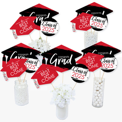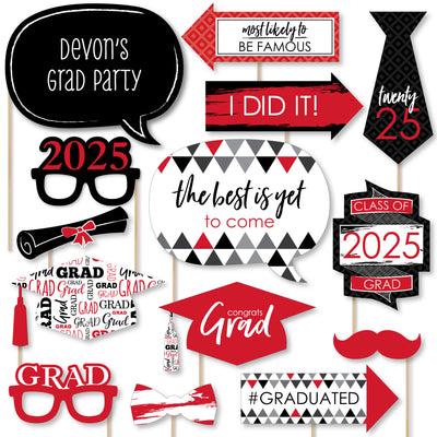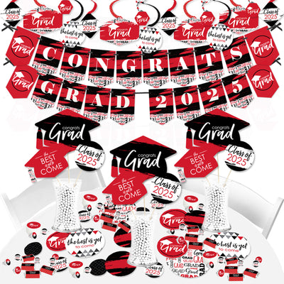 Honor your graduate and their years of hard work with a graduation party styled in the vibrant Best is Yet to Come – Red graduation theme. This collection of grad party supplies has everything you need to make their day memorable. Whether you are using red graduation party supplies to pay tribute to your grad’s school colors or to simply highlight their favorite color, these classic red and black grad party ideas are sure to make a statement. Begin by adding red graduation lawn decorations outside of your grad party, then fill your space with custom graduation party decorations in the same red & black design. From graduation photo booth props to eye-catching banners, there is something YOU-nique for every grad party.