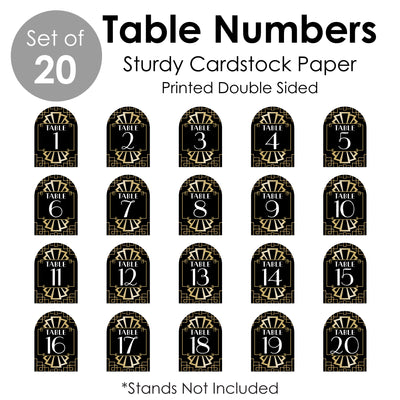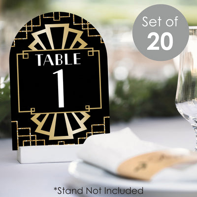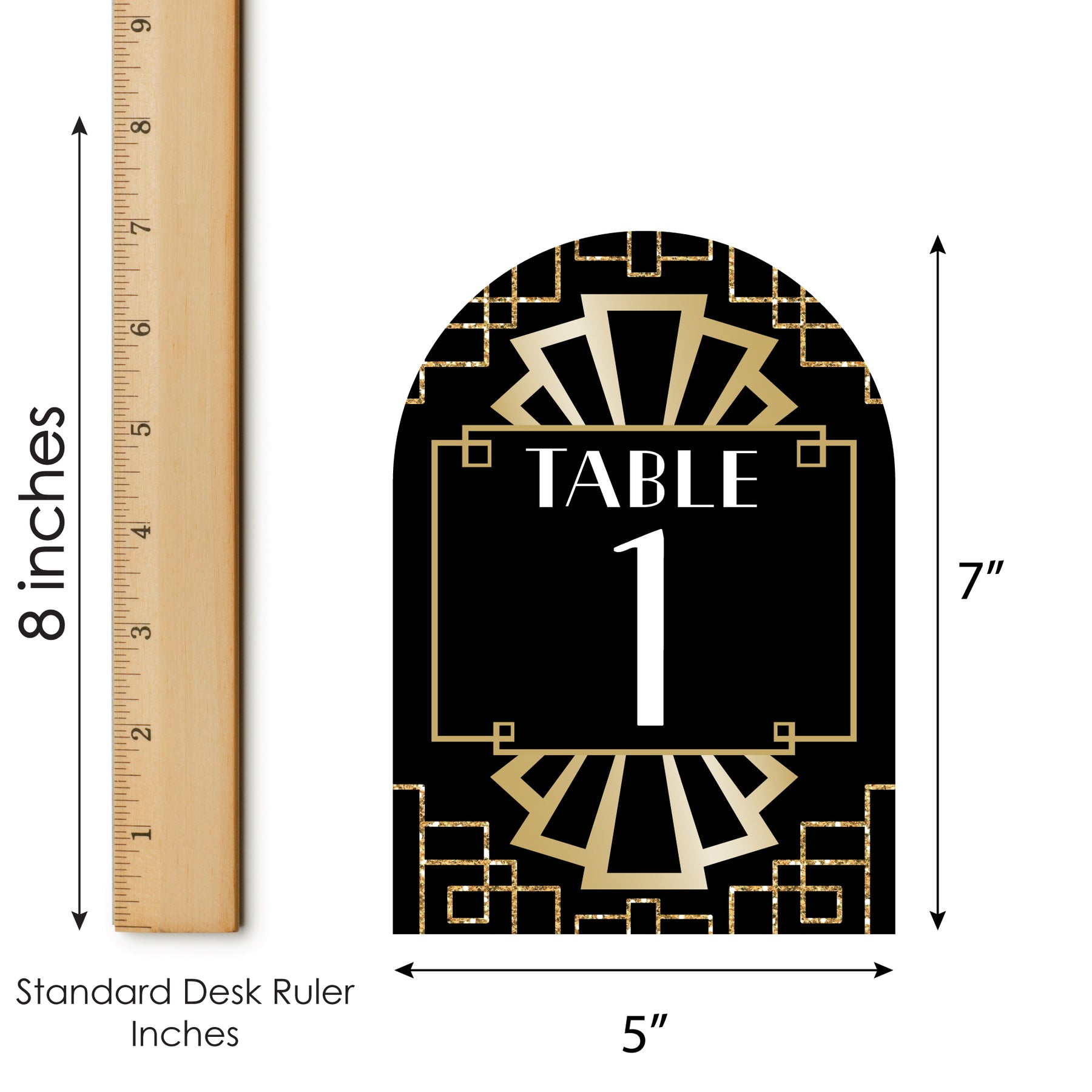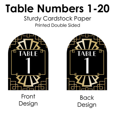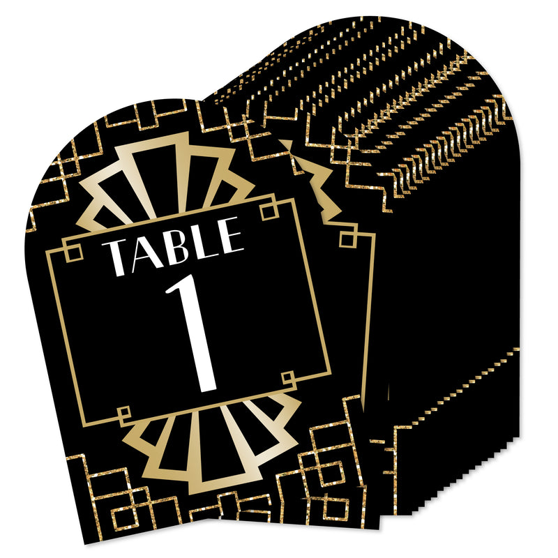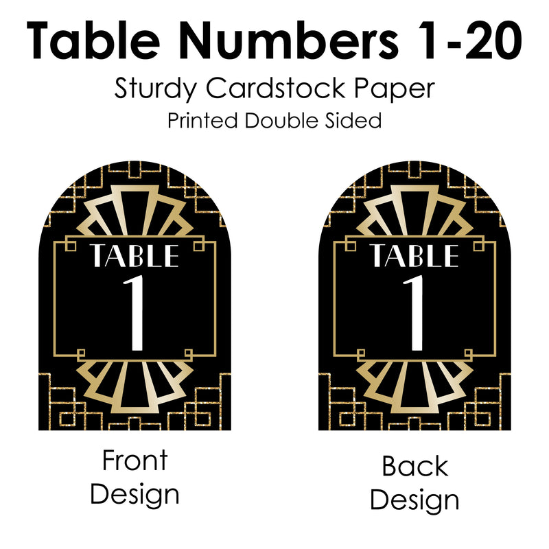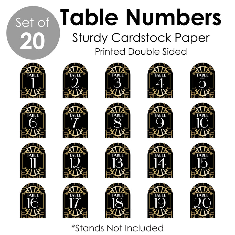 Add a special touch to your table setup with the Roaring 20’s Table Numbers. Ideal for a 1920s Art Deco Jazz Party, these charming table cards are numbered 1 through 20 and will stylishly help guide your guests to their tables. The Roaring 20’s Table Numbers are your no-fuss solution to adding that extra flair to your party decorations. Simply display at your table with your own stand, frame, or holder. You can also create elaborate table centerpieces by pairing the number cards with flowers, vases, and other decorative items. Professionally printed double-sided on sturdy cardstock paper, the Roaring 20’s Table Numbers come in an elegant arch-shaped cut-out design that will draw in attention and make it easy for guests to find their seating. Each card measures to be 5” wide by 7” tall. From large-scale celebrations to smaller get-togethers, the Roaring 20’s Table Numbers is the perfect party supply to use at your next special event!