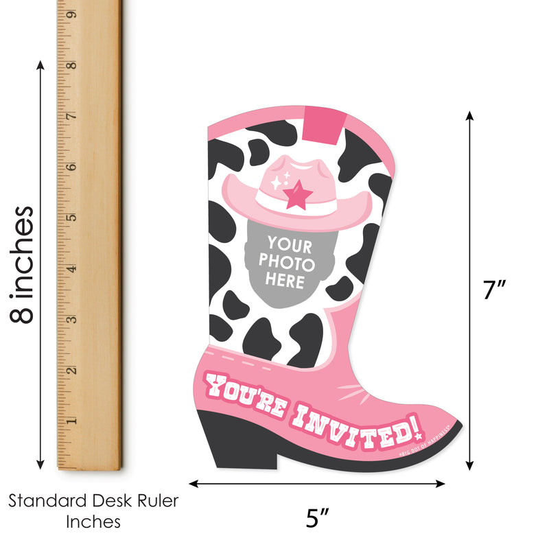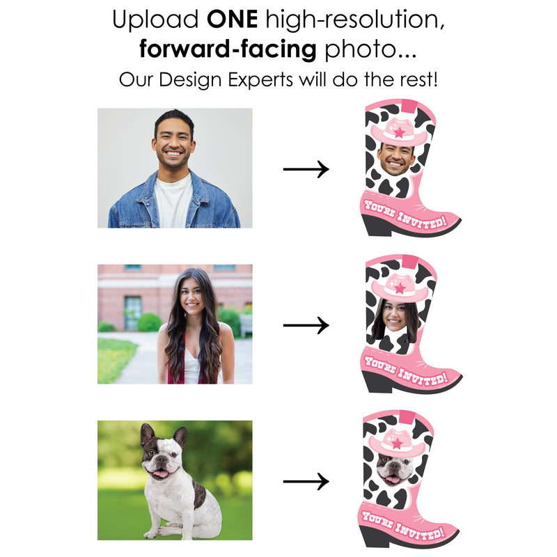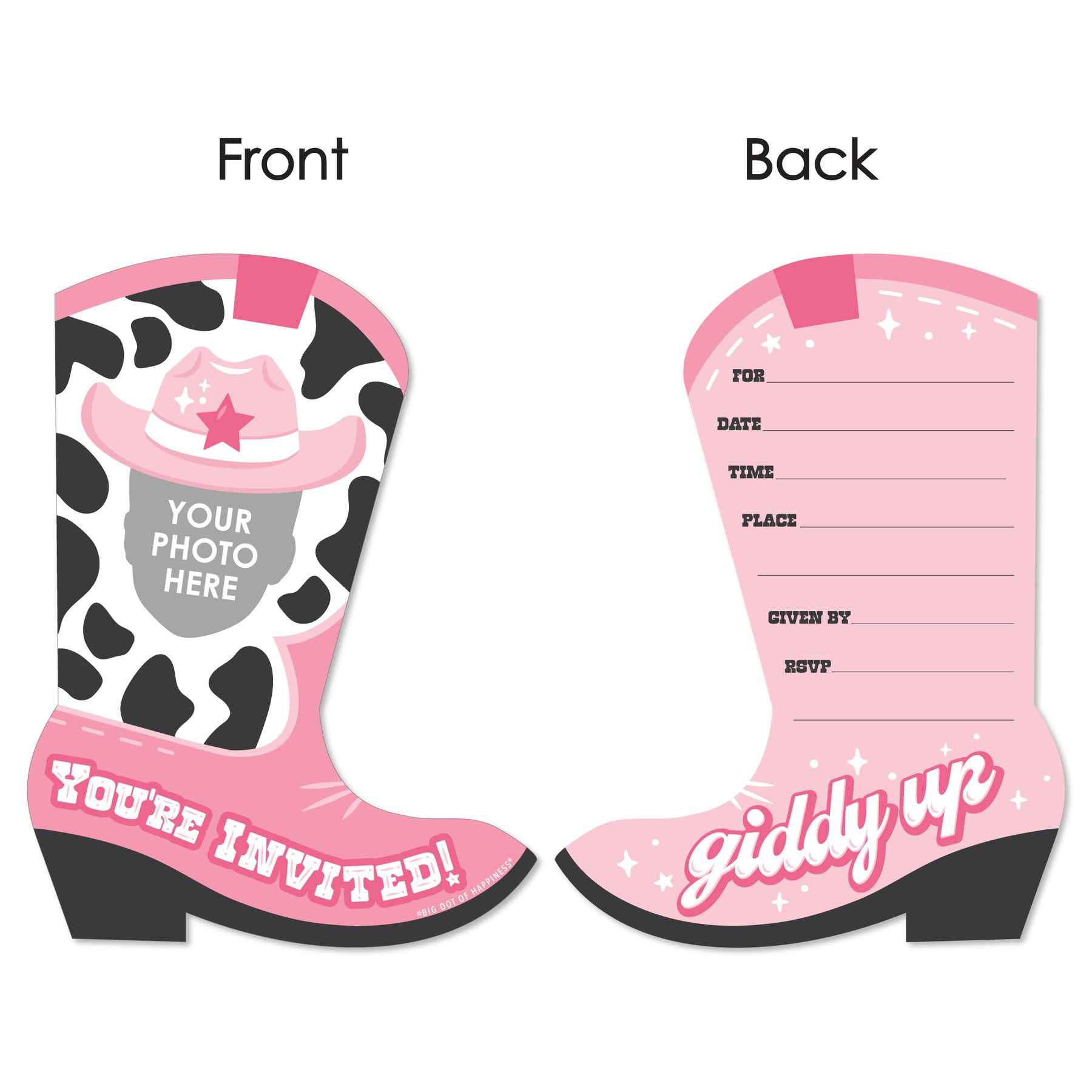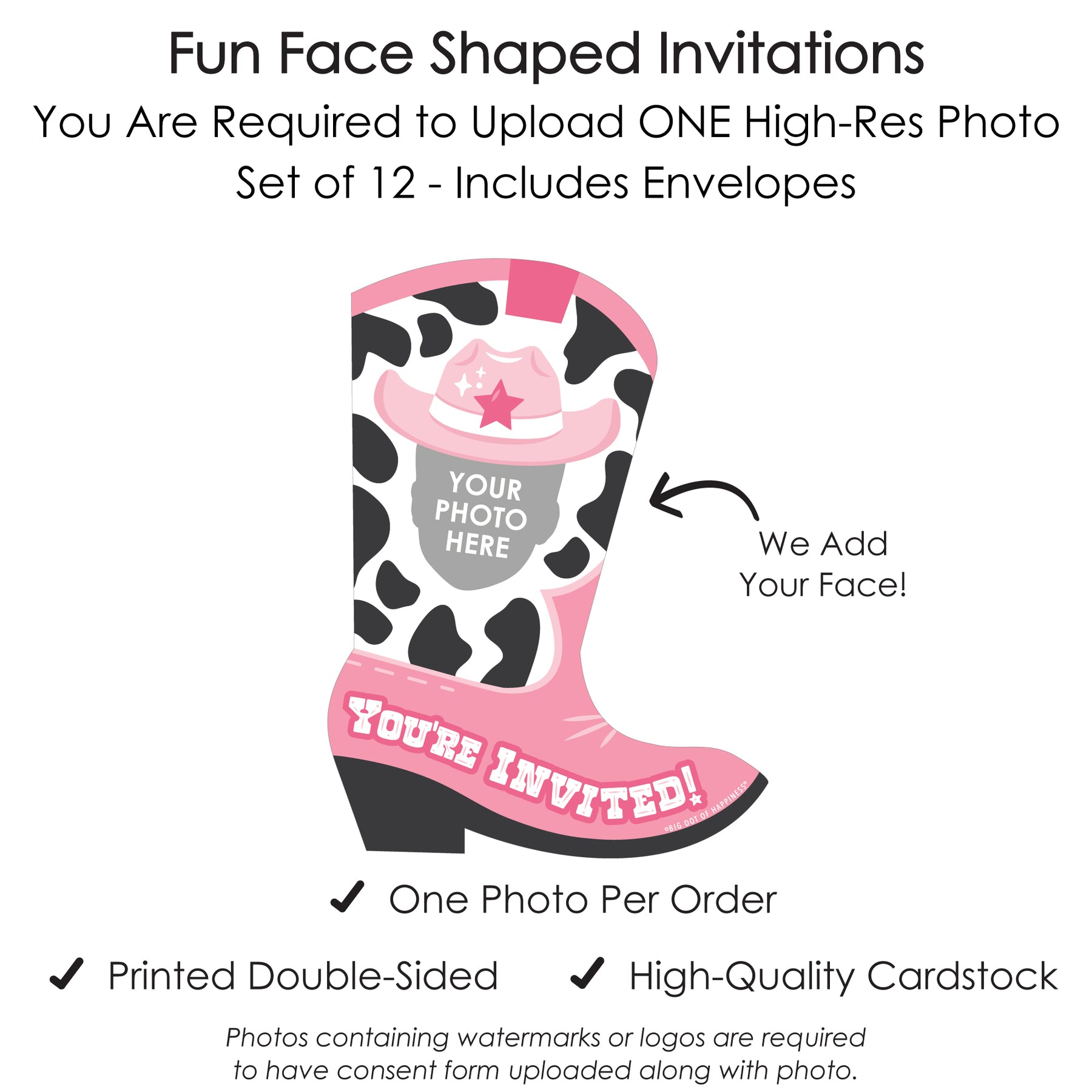 Build excitement for your upcoming Pink Cowgirl Bachelorette Party with the Last Rodeo Fun Face Shaped Invites! These fun and quirky invitation cards come in a set of 12 with white envelopes included and will feature ONE custom picture face cut-out. Professionally printed double-sided on high-quality cardstock paper, the Cowboy boot cards come with a photo-like shine on the front and a matte finish on the back, making it easy to handwrite all your party information. Enclose the invites in an envelope and then you can either hand-deliver the invitations or send the invites via snail mail. Your recipients will be delighted when they receive their Last Rodeo party stationery and can also keep the invite card as a fun photo keepsake! Make your celebration extra special when you prepare for your party with the pink western custom photo invitation set!