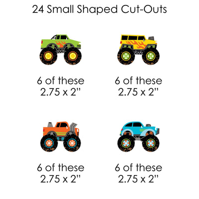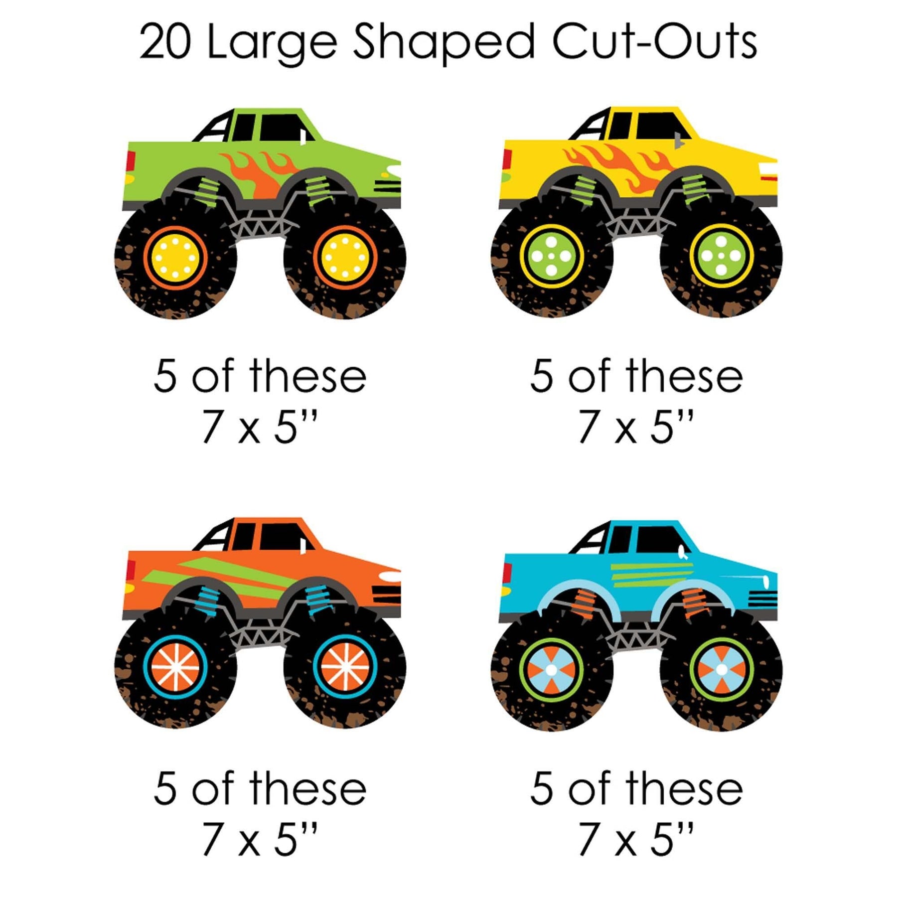 Easily decorate your Boy Birthday Party with Smash and Crash - Monster Truck clothespin garland banner. This DIY banner kit includes 44-pieces of Smash and Crash - Monster Truck paper cut-outs, 50 mini clothespins, and white cord. Before hanging, plan out your desired pattern by alternating in sizes. Using a miniature clothespin, clip shapes on the included cord. Hang finished DIY garland banner at the entrance of your party, over mantelpiece, along buffet tables, or as high chair banner decoration. After the party, reuse the clothespins and cord to hang event photos as a fun keepsake. Smash and Crash - Monster Truck large cut-outs are professionally printed double-sided, small cut-outs are professionally printed with coordinating pattern on back, and all on sturdy cardstock paper with a photo-like shine.