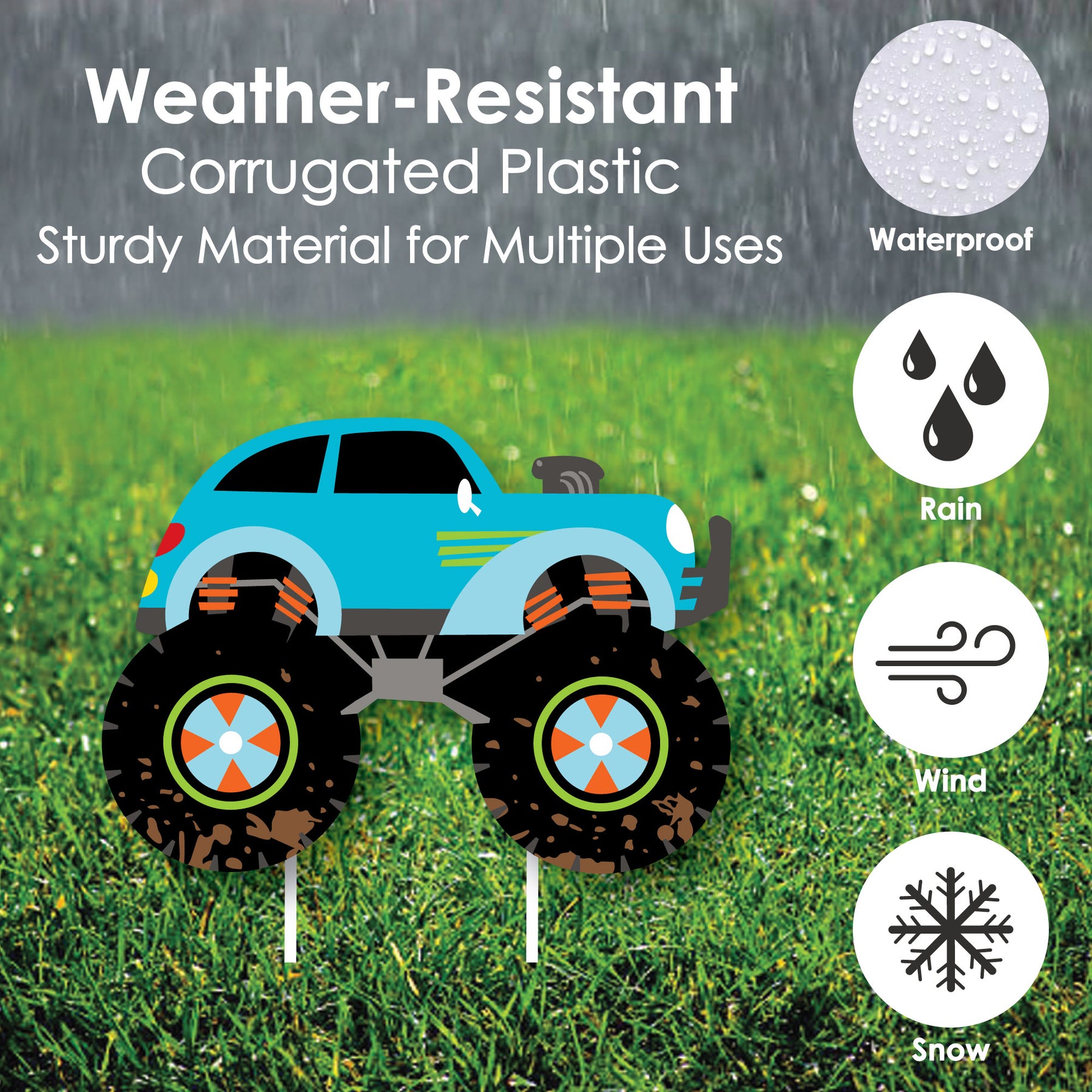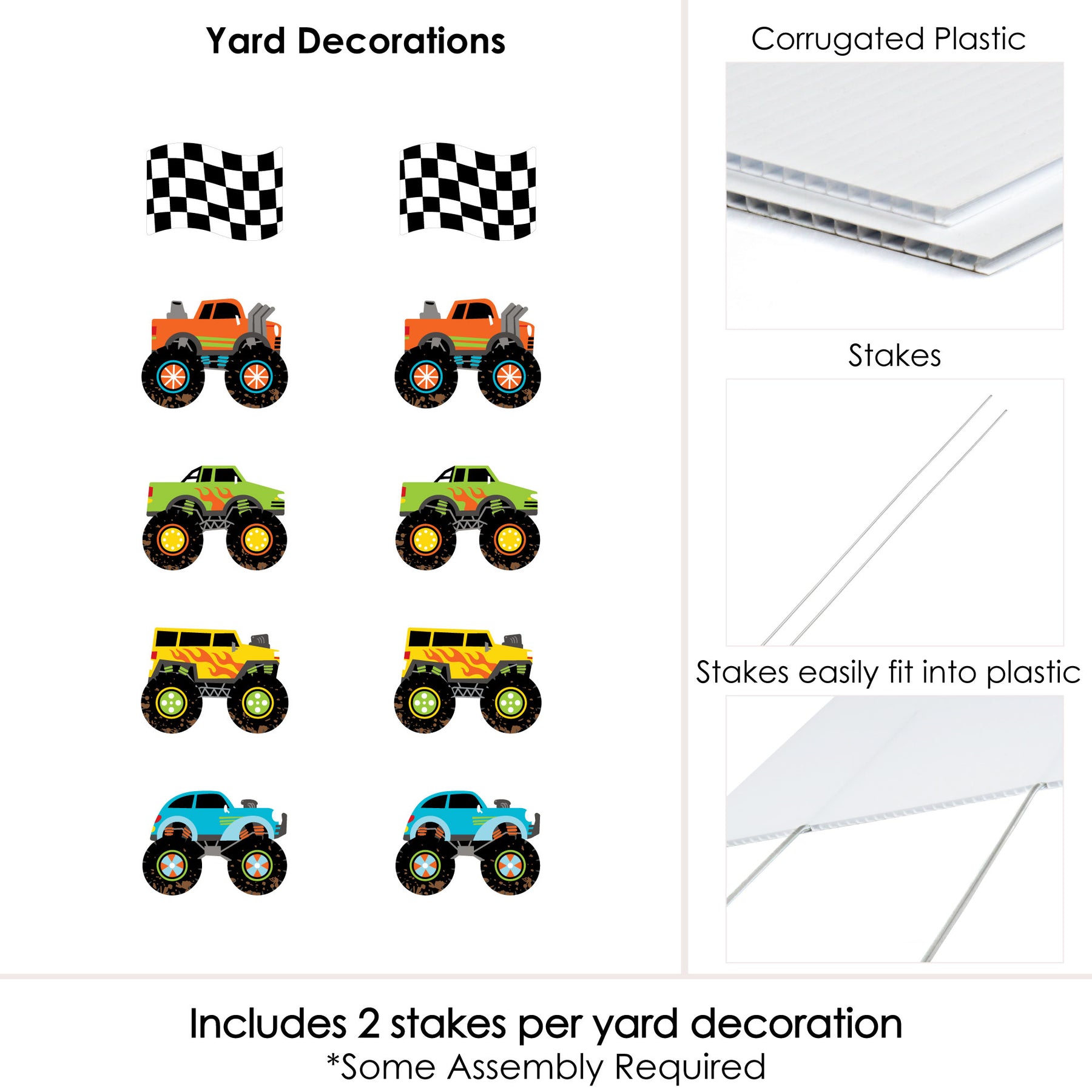 An impressive Smash and Crash - Monster Truck yard sign is sure to delight your guests and surprise everyone. This 10-piece set of Smash and Crash - Monster Truck lawn decorations is professionally printed with vivid colors to really make a statement wherever it is used. Each shaped outdoor sign comes with two stakes, making it easy to display on lawns, driveways or courtyards. Best of all, Smash and Crash - Monster Truck shapes are cut separately so you can arrange them any way you please. This decorative yard sign is made of waterproof plastic and is weather resistant, perfect for short-term display but can be used again and again with proper care.