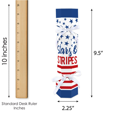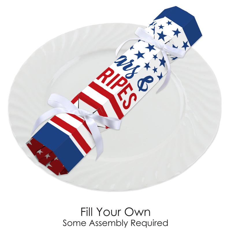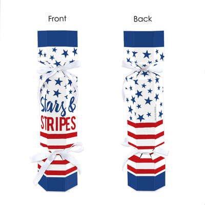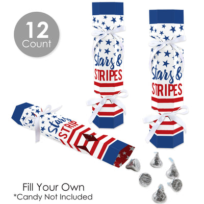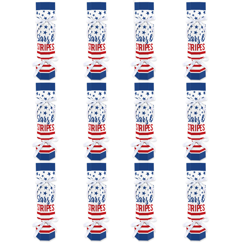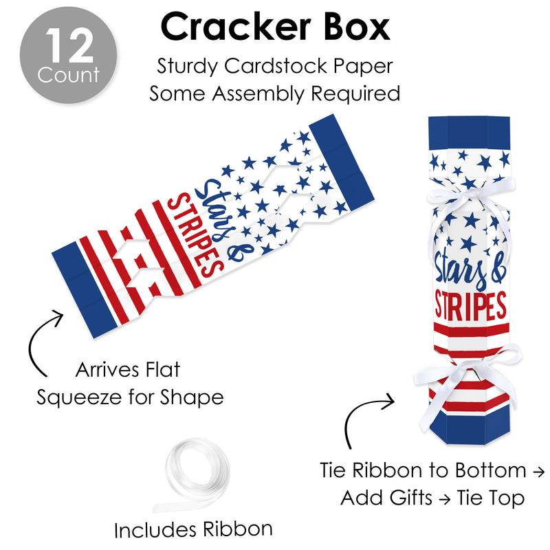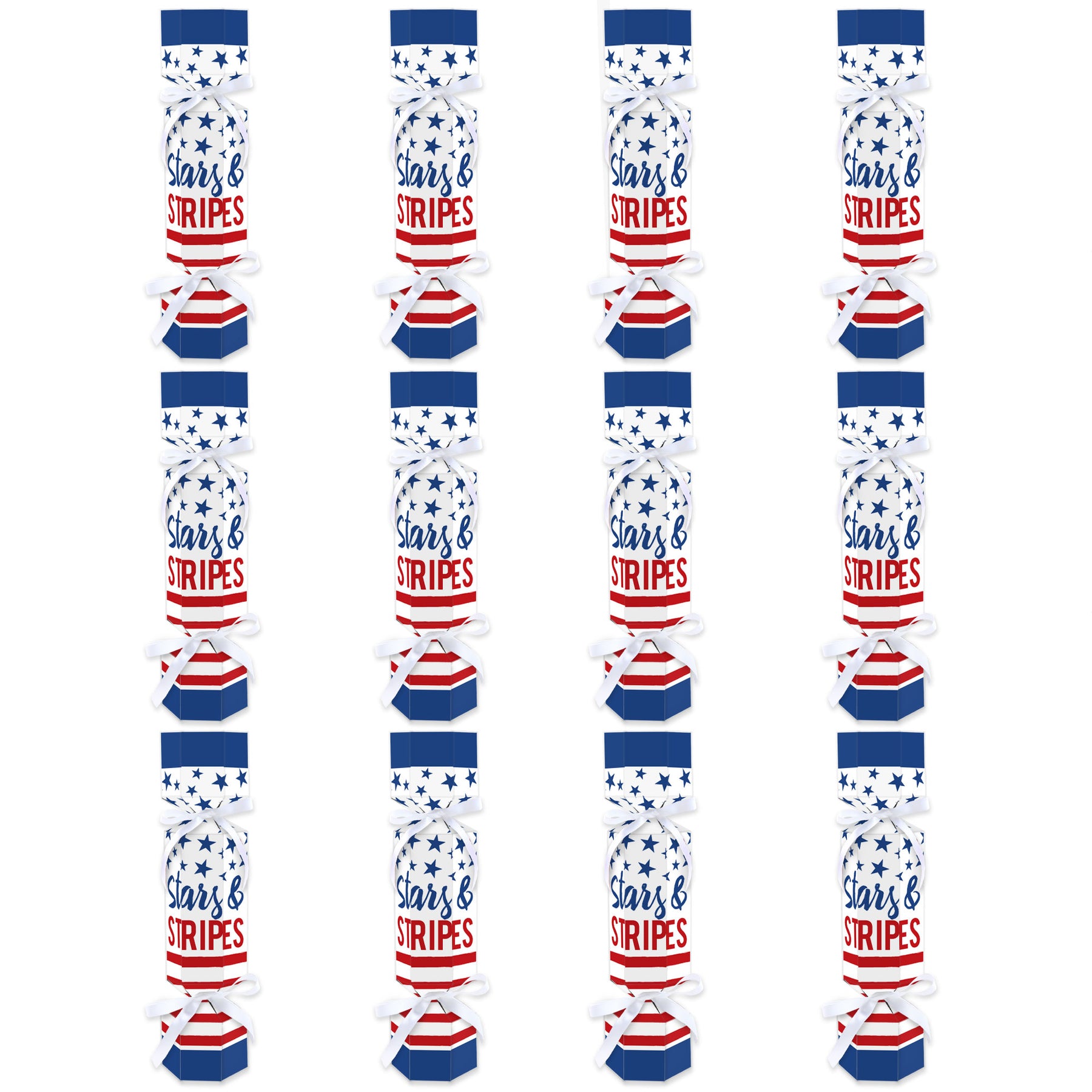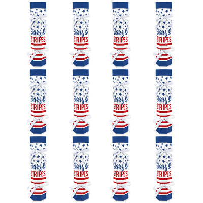 Make your Patriotic Party unforgettable when you present your guests with the fun and playful no-snap Stars & Stripes Cracker Boxes. Coming in a set of 12, these DIY candy-shaped favor boxes include coordinating satin ribbon and are perfect for holding small treats and gifts! Get started assembling Stars & Stripes party crackers by gently squeezing along the creased line to form the hexagonal shape. Tightly tie a ribbon around the bottom section of cutout diamonds and then begin filling your box with your party goodies. Finish it off by tying a ribbon around the top section, which will give you the final candy-like shape. Stars & Stripes DIY non-snap cracker boxes are professionally printed double-sided on heavy-duty cardstock paper with a photo-like shine and measure to be 2.25” wide by 9.5” tall when assembled. Use them as party table decorations or hand them to your guests as take-home party favors! Add some extra cheer to your celebration when you use the Stars & Stripes Cracker Boxes at your celebration!