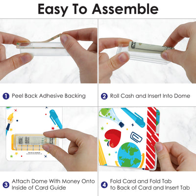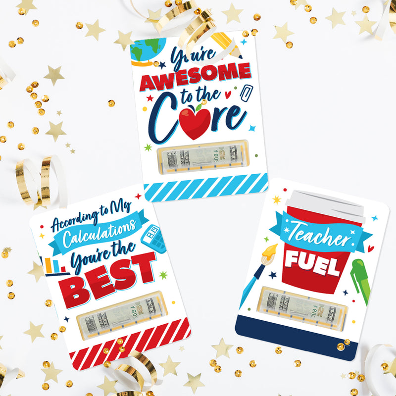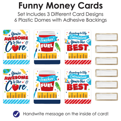 Give a fun and memorable gift when you present your recipient with a Thank You Teachers Funny Money Card! Coming in a set of 6, these assorted DIY Teacher Appreciation Week greeting cards feature 3 hilarious phrases (2 of each) and 6 plastic domes with adhesive backings that can hold rolled-up money. To assemble your Appreciation cash card gift, peel back the adhesive backing on the plastic dome. Roll your cash and insert it into the dome. Next, attach the dome with money onto the inside of the card, placing it on the rectangular guide. Then, finish by folding the card and folding the bottom tab to the back of the card. Thank You Teachers money holders are professionally printed double-sided on high-quality cardstock paper with a photo-like shine on the outside. The inside will be matte, making it easy to handwrite a personal message on the inside of the card. Fun and creative, the Thank You Teachers money gift holder will delight your loved one and will show them how much you care. The funny card paired with your heartfelt note will give them a good laugh, and they will appreciate the flexibility to choose how to spend their cash Teacher Appreciation Week gift. Take the guesswork out of "what to give" when you surprise your recipient with the Thank You Teachers Funny Money Cards!