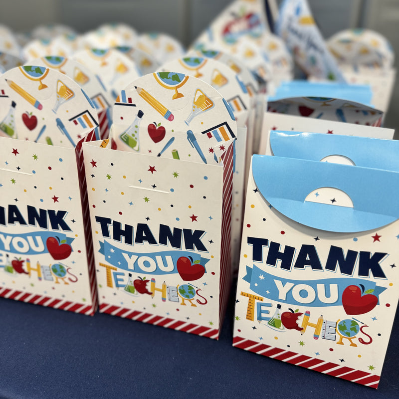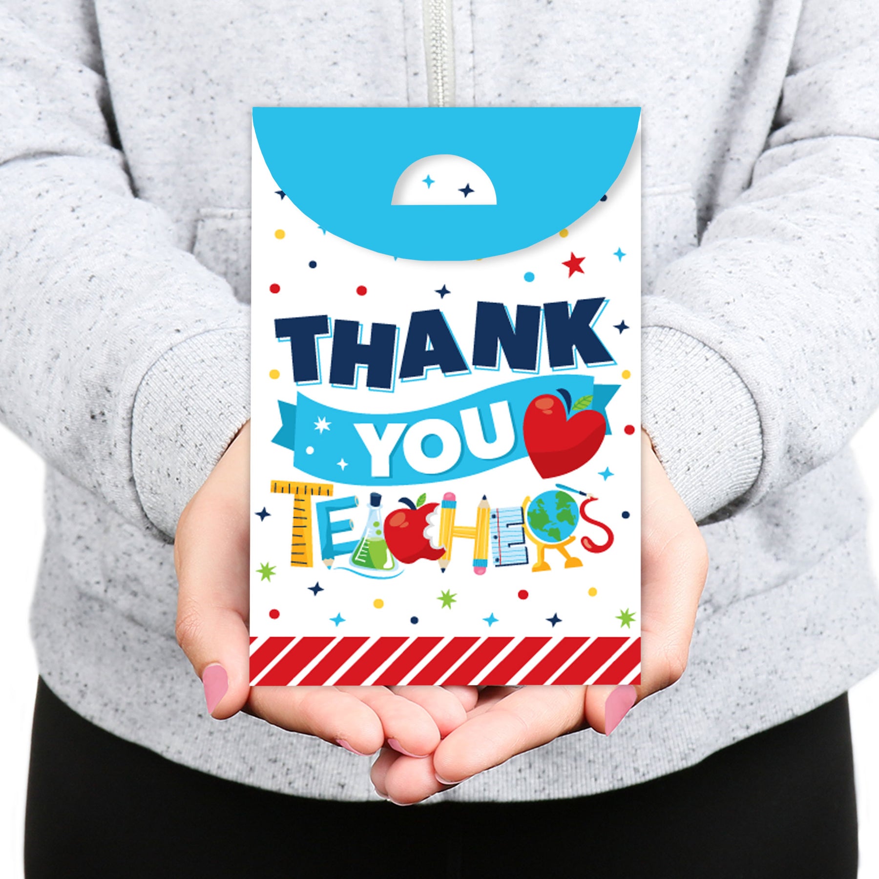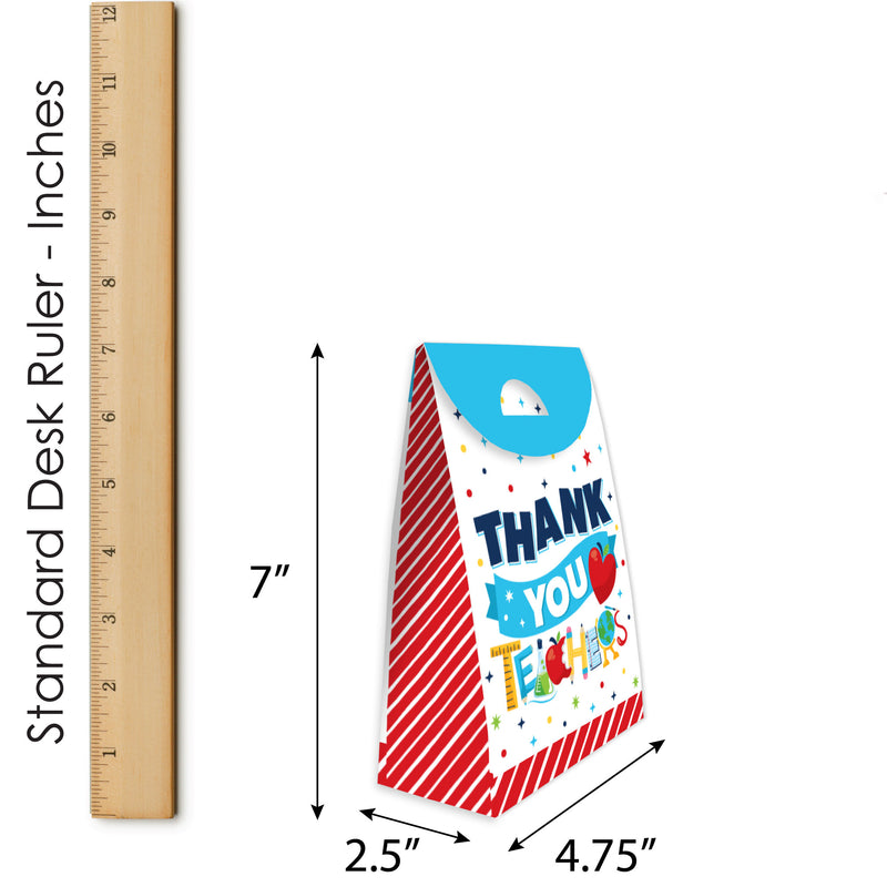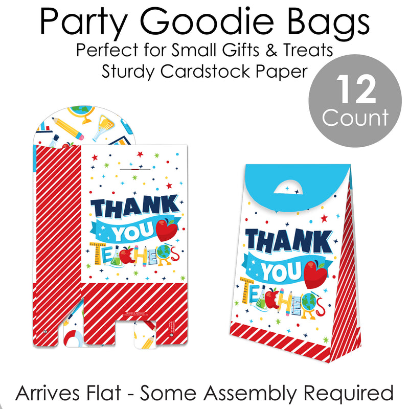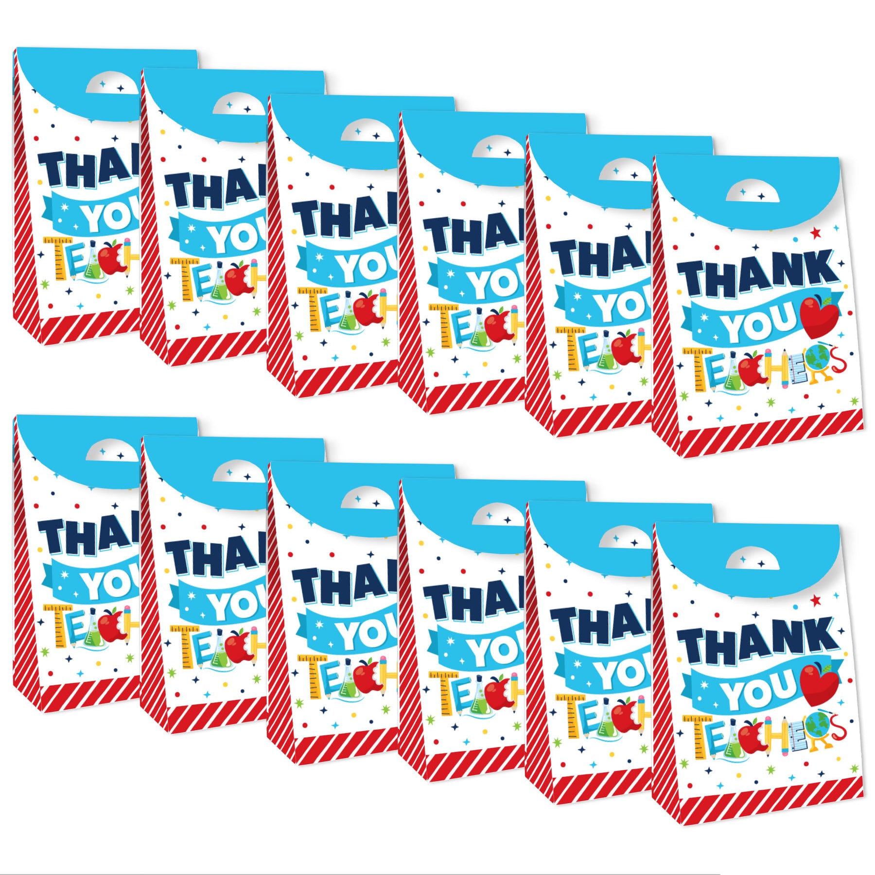 From small treats to trinkets and gifts, thrill your guests with the Thank You Teachers Party Goodie Bags! Ideal for your Teacher Appreciation Party, these party loot bags measure to be 4.75” long x 2.5” wide x 7” tall and will certainly be a delight at your celebration. The Thank You Teachers party bags come in a set of 12 and are professionally printed double-sided on sturdy cardstock paper with some easy DIY assembly required. Each favor bag includes creased lines and numbered tabs for easy folding. To close the bag, fold over the top flap and insert the tab inside the slit to secure it shut. Packaging will also include assembly instructions. Fill these swag bags with small surprises inside and place them at your dessert table for guests to grab and take home. Make your celebration complete when you delight your guests with the Thank You Teachers Party Goodie Bags.