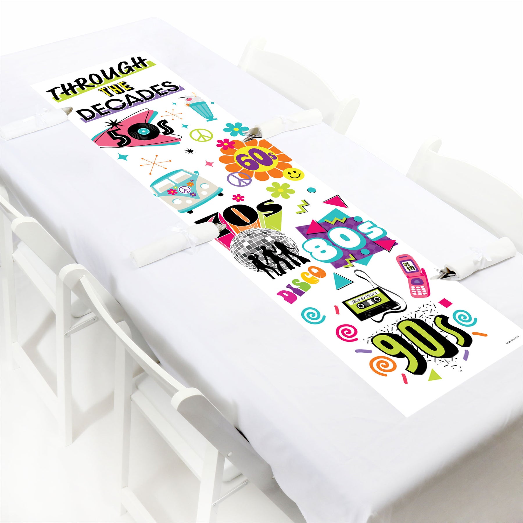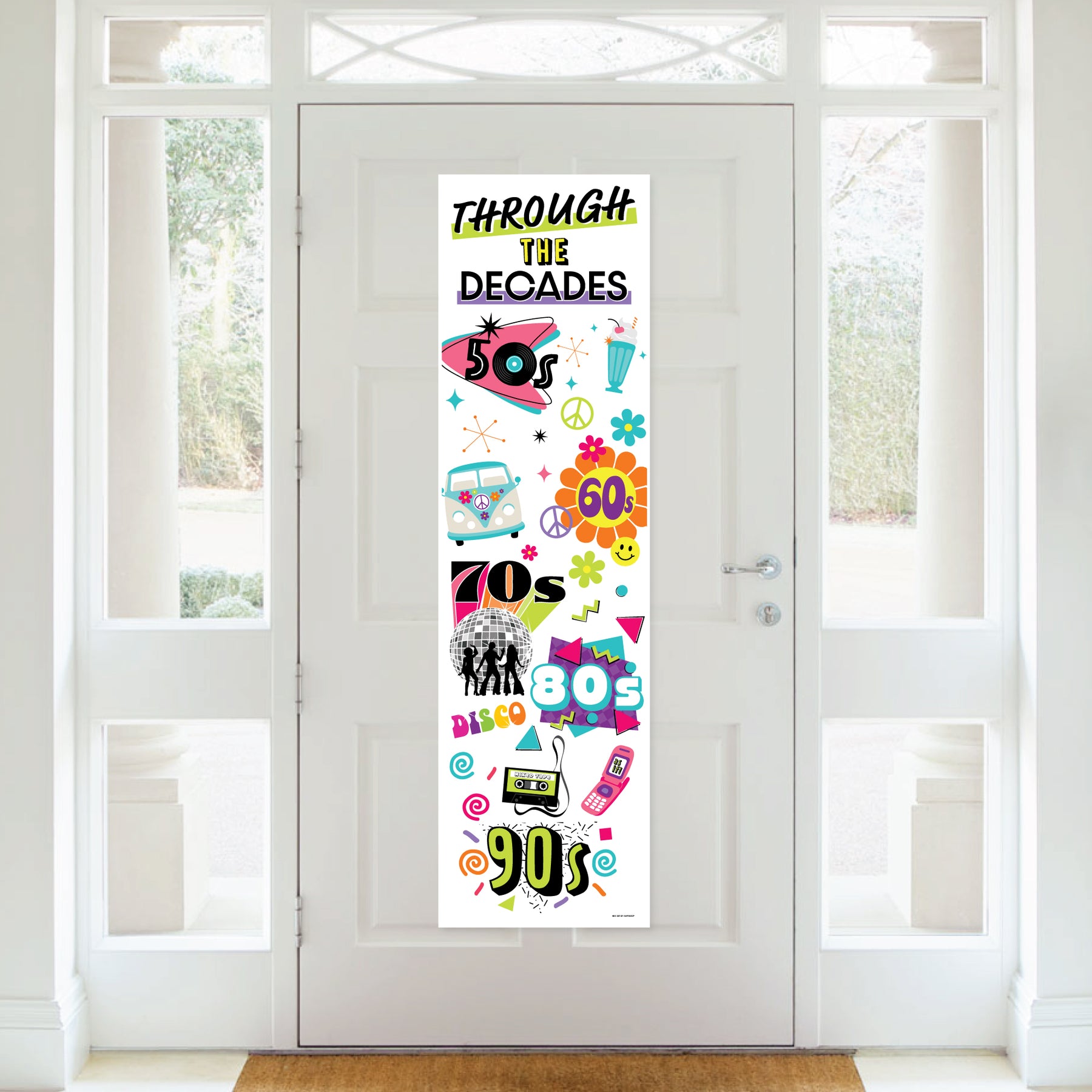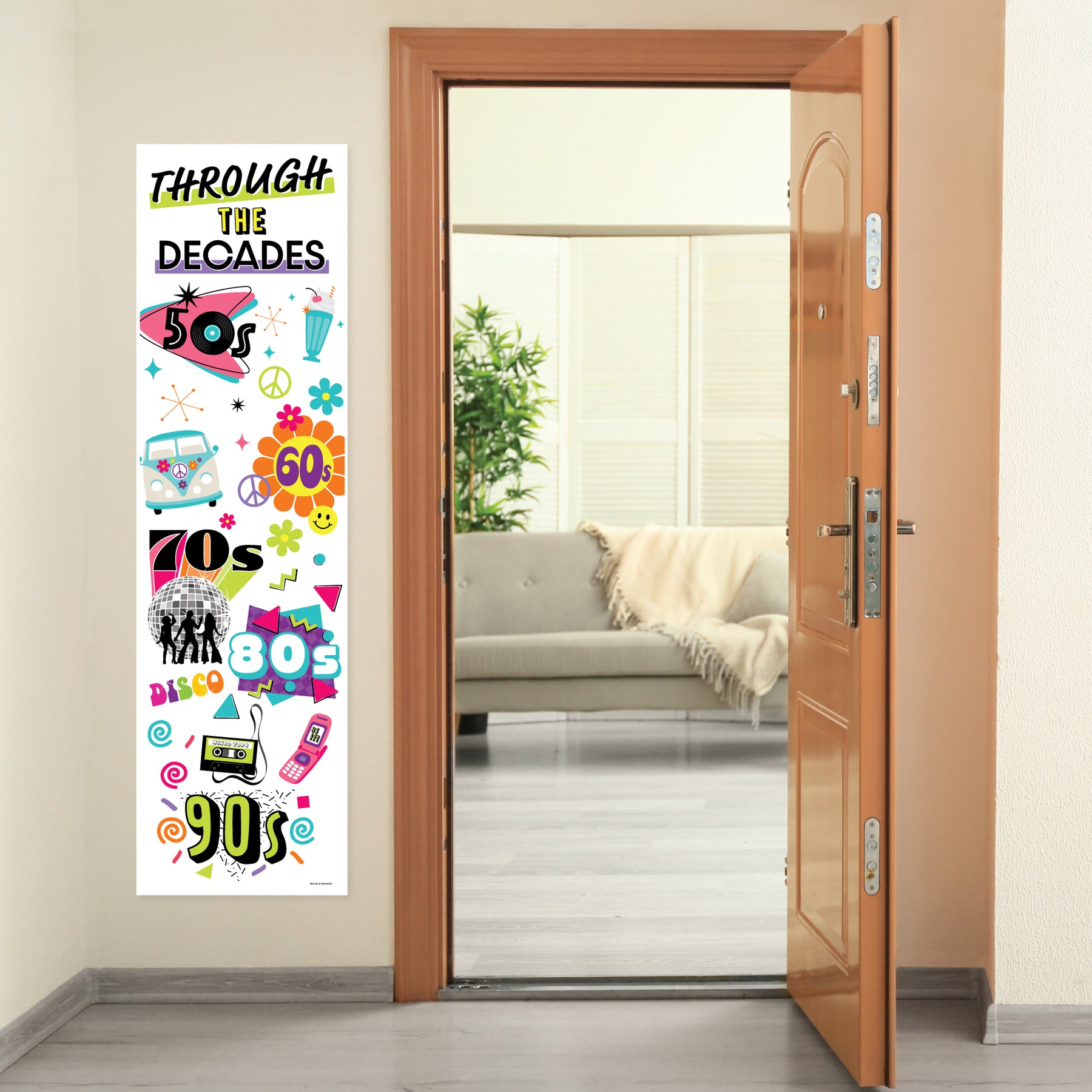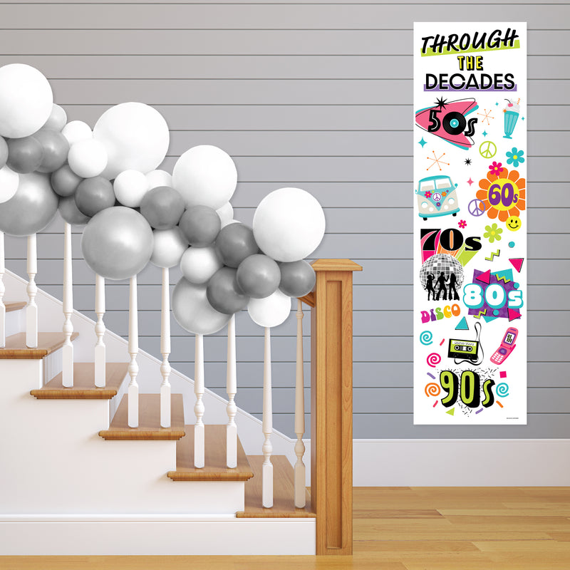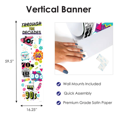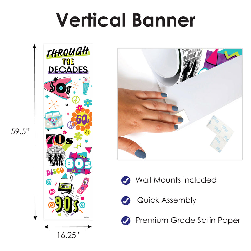 Create a memorable and stylish atmosphere at your celebration when you decorate with the Through the Decades Vertical Banner. Perfect for your Prom, Birthday or Retirement Party, the “Through the Decades” banner will wow your guests and add a festive flair to all areas of your event. Simply unroll the Through the Decades banner, attach the included poster mounts, and then display the banner in your desired location. (TIP: To flatten your banner, roll it in the opposite direction.) You can hang your banner on the wall or welcome guests when you put the banner on your front door. Fun and easy to use, the Through the Decades vertical decoration will also look excellent in a photo booth backdrop and can be used as a paper table runner. No need to worry about spills! The banner is water-resistant and will stay flawless even when it is wet! Professionally printed on premium satin paper with vibrant colors, the Through the Decades banner is a showstopping addition to your party decor. Bring your party to the next level when you hang up the Through the Decades Vertical Banner.