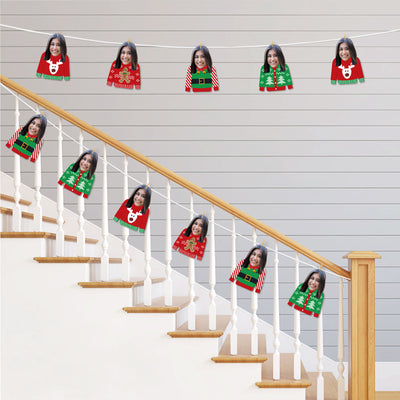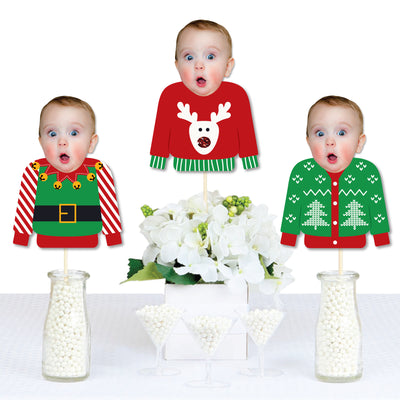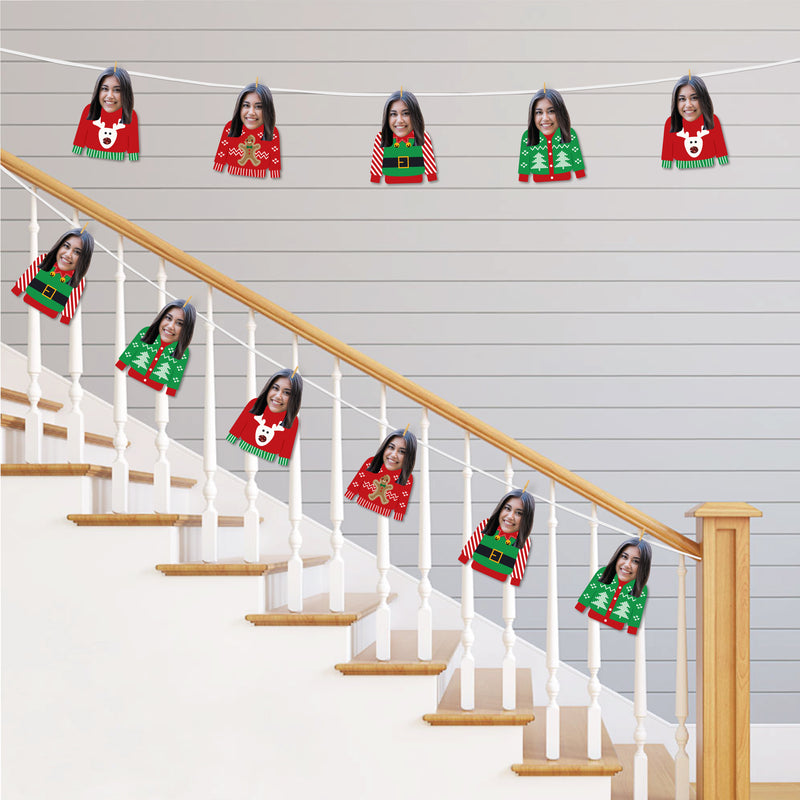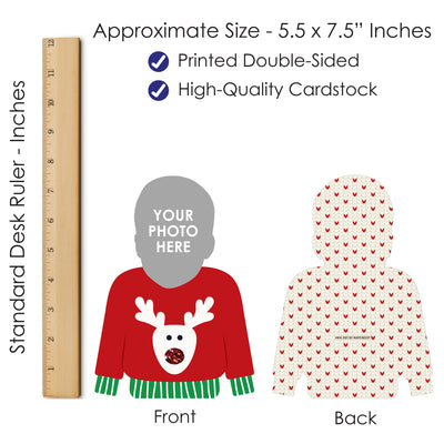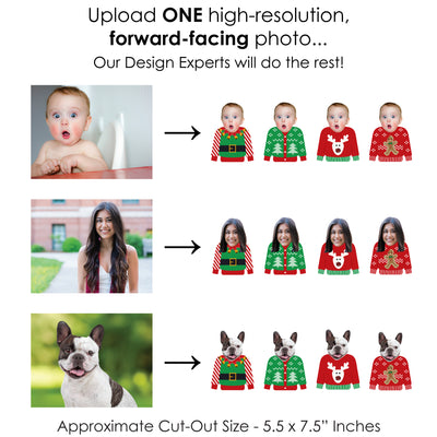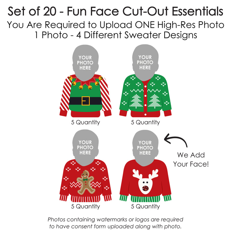 Get creative when you decorate with the set of 20 custom Ugly Sweater Fun Face Essentials. The perfect way to spotlight your guest of honor, these custom paper shapes will feature ONE face photo on 4 different sweater designs that will transform your Holiday and Christmas Party into an unforgettable celebration! Professionally printed double-sided on cardstock paper, the customized Ugly Sweater cutouts are a versatile DIY party decoration that will have you ready to unleash your creativity. You can scatter the Christmas large shaped cut-outs throughout your venue, hang them in a garland banner, or use them as eye-catching centerpieces for a unique tablescape. The face cutouts will make a statement however you choose to use them! Have fun decorating when you honor your family member, friend, or beloved pet with these fun and quirky custom sweatshirts face essential cutouts.