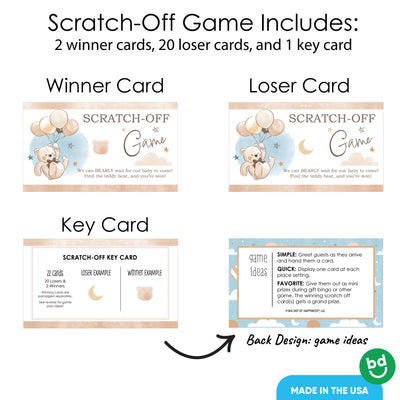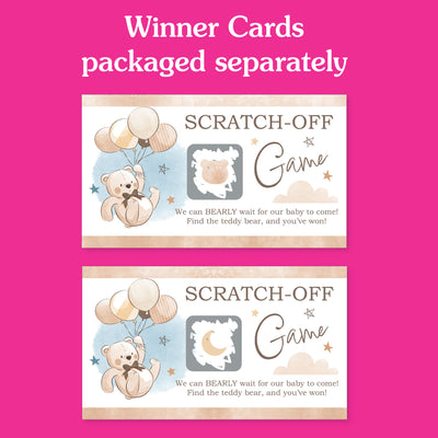 Everyone will love to play this little teddy bear Baby Shower game! Our We Can Bearly Wait scratch off cards makes giving out door prizes a breeze and guests love scratching them to see what is underneath the prism square! Try the game ideas below and plan your teddy bear baby shower celebration the easy way. Just be sure to have enough for everyone because no one will want to miss out on playing this party game.