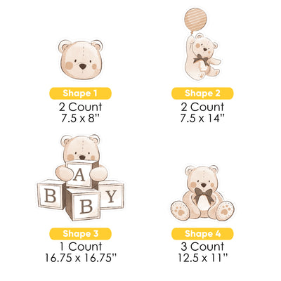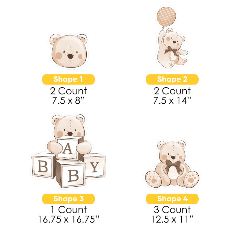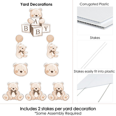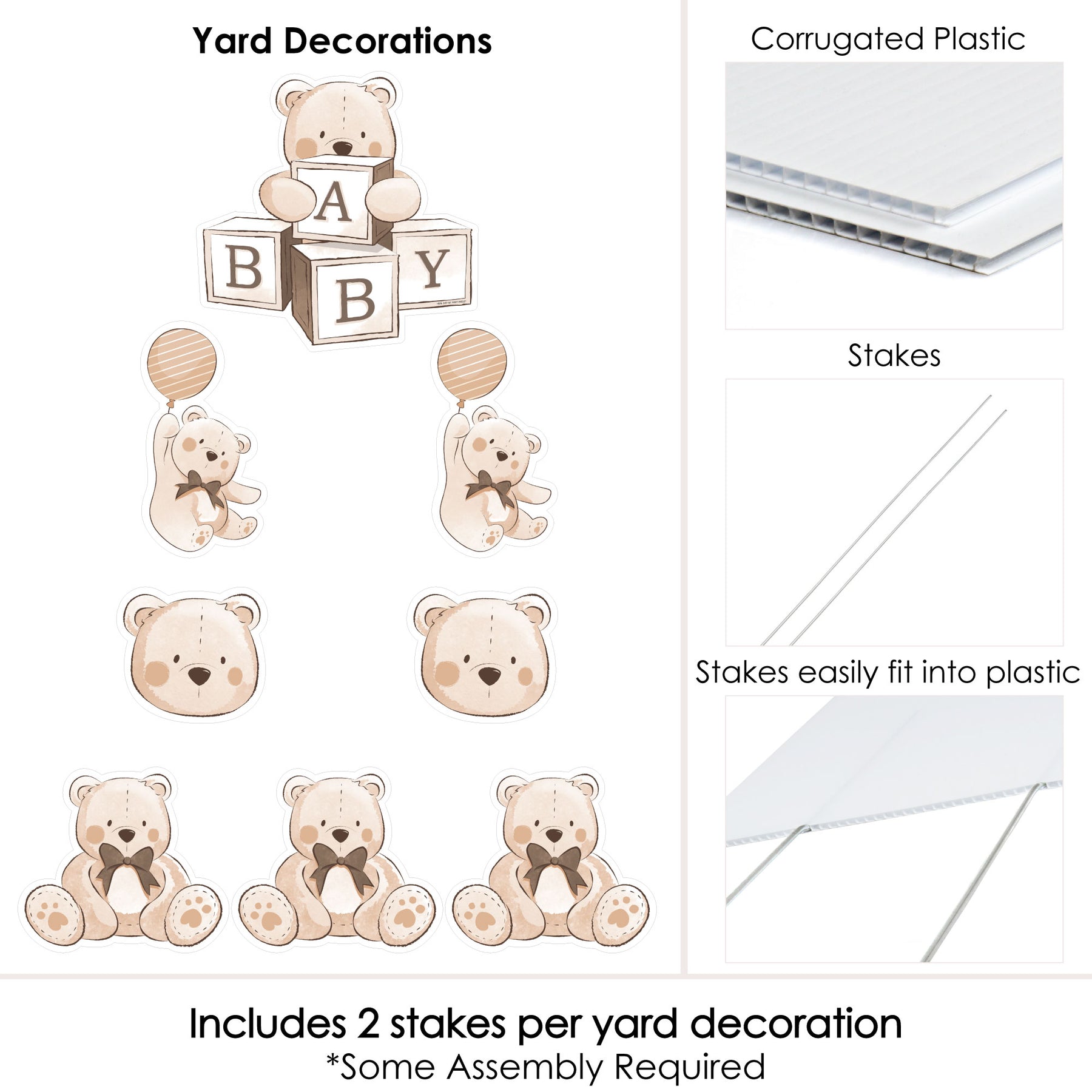 An impressive We Can Bearly Wait yard sign is sure to delight your guests and surprise everyone. This 8-piece set of Teddy Bear Baby Shower Yard decorations are professionally printed with vivid colors to really make a statement wherever it is used. Each outdoor shape comes with two stakes, making it easy to display on lawns, driveways or courtyards. Best of all, the shapes are cut separately so you can arrange them any way you please. These decorative yard signs are made of waterproof plastic and are weather resistant, perfect for short-term display but can be used again and again with proper care.
