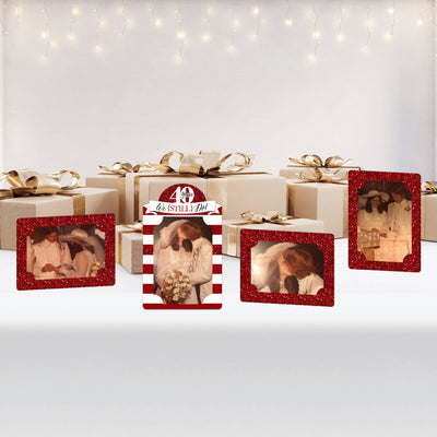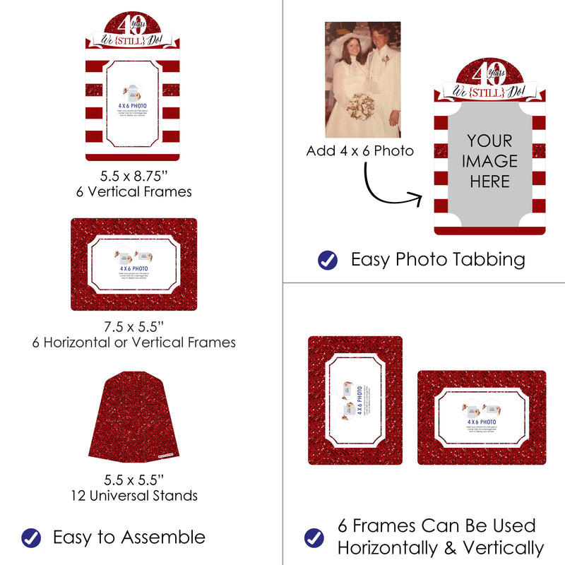 Shine the light on your guest of honor when you decorate with the We Still Do - 40th Wedding Anniversary Paper Photo Frames at your Anniversary Party. This set of 12 photo holders includes 6 vertical frames with round-shaped tops and 6 standard rectangular frames that can be displayed vertically or horizontally. To use, begin by attaching the center tabs of the frame to the corresponding slots on the stand. Next, fold the sides of the stand towards the center and fold the support piece until it rests in the notches. Finally, place your 4x6 photos into the frames and secure them into place with the corner tabs. We Still Do - 40th Wedding Anniversary paper frames are professionally printed on sturdy cardstock paper and are a damage-free way to showcase your favorite pictures of your guest of honor. Use the We Still Do - 40th Wedding Anniversary picture frames at the welcome table, place them as table centerpieces, or utilize them for mantel decorations. You can also hang the frames on your wall or make a banner using your own string and adhesives. Make your celebration picture-perfect when you highlight your guest of honor’s memories and milestones with the We Still Do - 40th Wedding Anniversary Paper Photo Frames.