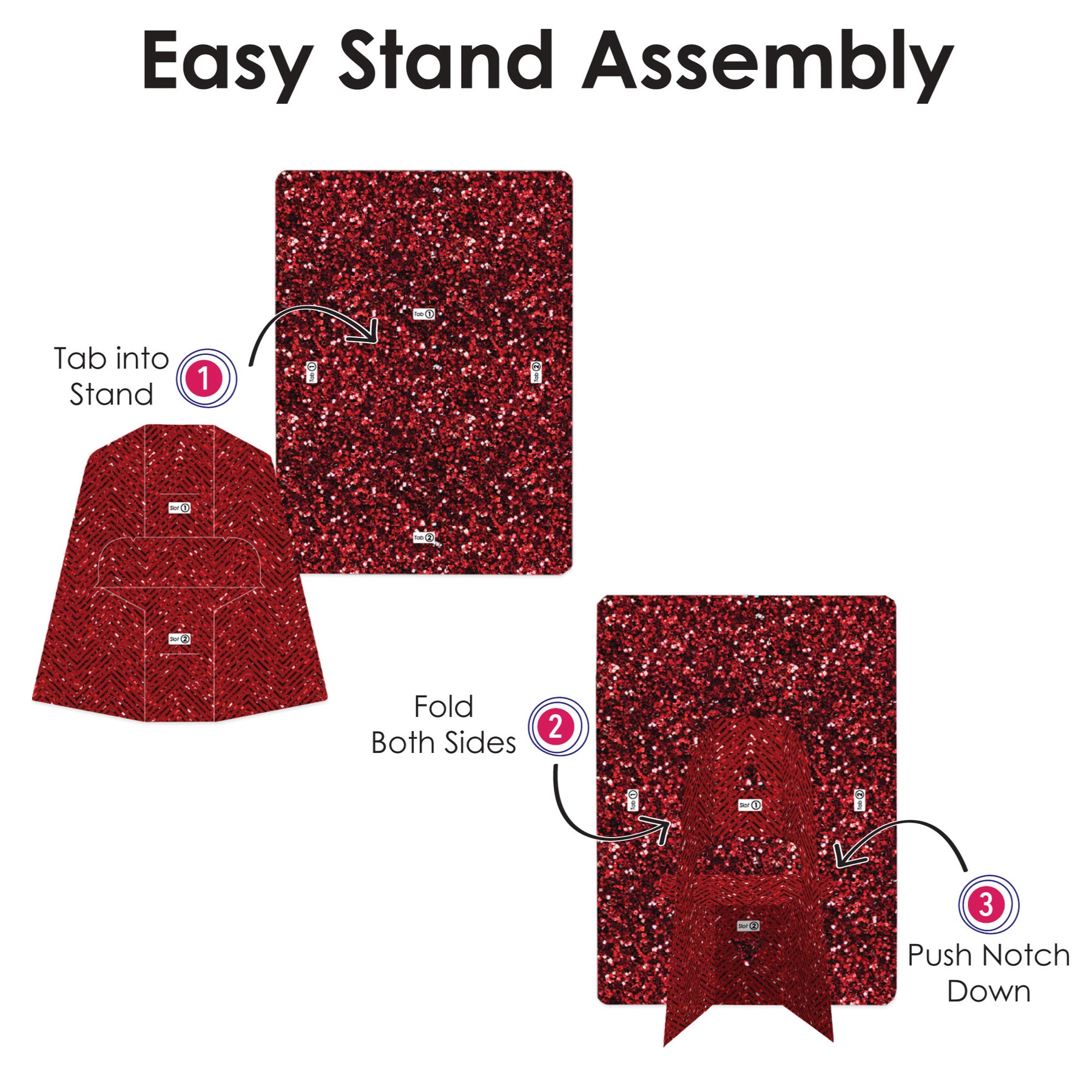 Easy Stand Assembly - Tab into Stand, Fold Both Sides, and Push Notch Down