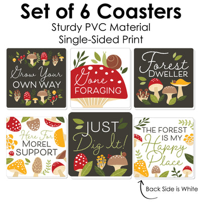 Whether a cocktail party or casual dinner, Wild Mushrooms Funny Drink Coasters will be an instant favorite for both the Red Toadstool Party host and party guests. This set of 6 Coasters is professionally printed one-sided on sturdy PVC material to help protect your table from drips, spills, and condensation. Wild Mushrooms Coasters are great for most glasses and mugs and can be used for hot or cold drinks. This Drink Coaster Set is easy to clean, just use soap and water to wipe clean. Drink Coasters make for a perfect gift idea! With different eye-catching designs, guests can use a Wild Mushrooms Coaster as a drink marker and then take home as a fun party favor. Gift the full set of Coasters as a unique housewarming present or gift to a loved one with a sense of humor.
