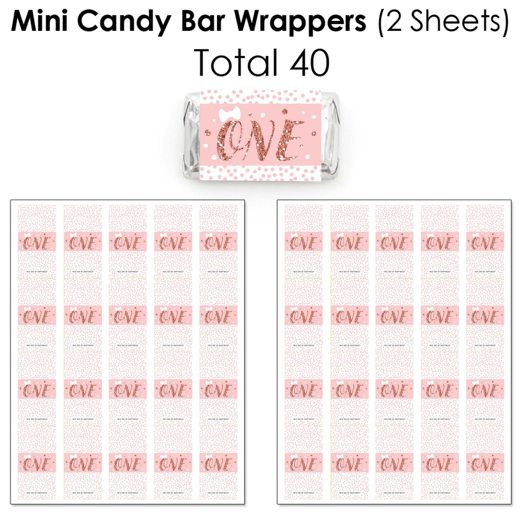 2 Sheets of Mini Candy Bar Wrappers (total 40) size 1.25 inches wide x 2.75 inches high and fit Hershey® Miniatures® candy bars.