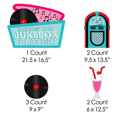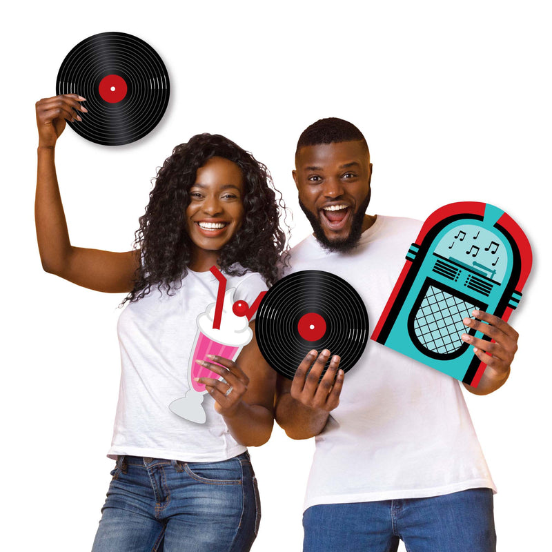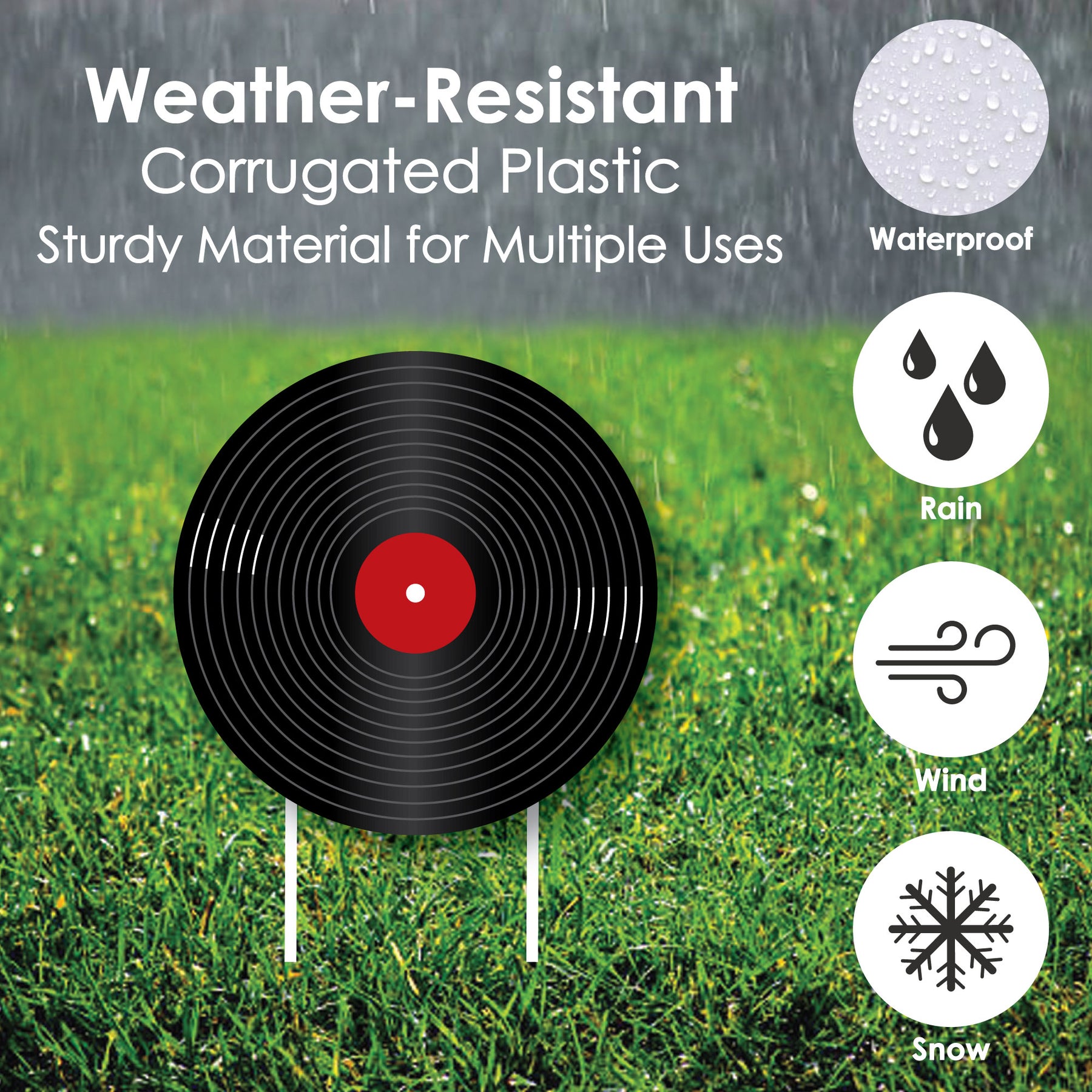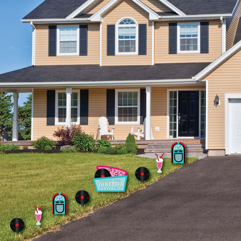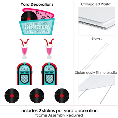 An impressive 50's Sock Hop yard sign is sure to delight your guests and surprise everyone. This 8-piece set of 1950s Rock N Roll Party lawn decorations is professionally printed with vivid colors to really make a statement wherever it is used. Each outdoor shape comes with two stakes, making it easy to display on lawns, driveways or courtyards. Best of all, 50's Sock Hop shapes are cut separately so you can arrange them any way you please. These decorative yard signs are made of waterproof plastic and are weather resistant, perfect for short-term display but can be used again and again with proper care.