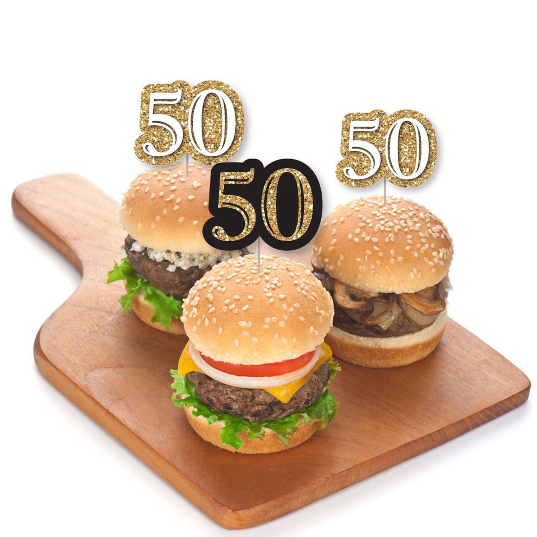 Create a unique dessert bar at your Birthday Party with Adult 50th Birthday - Gold Dessert Cupcake Toppers. This do-it-yourself kit includes clear treat picks and fun shaped cut outs. Simply attach each double-sided paper cut out to a clear plastic pick with the included clear stickers. Dessert Cupcake Toppers look great on standard cupcakes or add them to other baked goodies such as brownies or donuts. Other appetizers and miniature fruit kabobs are also easy to make with these fun food picks. Get creative and bring all your party ideas to life with Adult 50th Birthday - Gold Dessert Cupcake Toppers.
