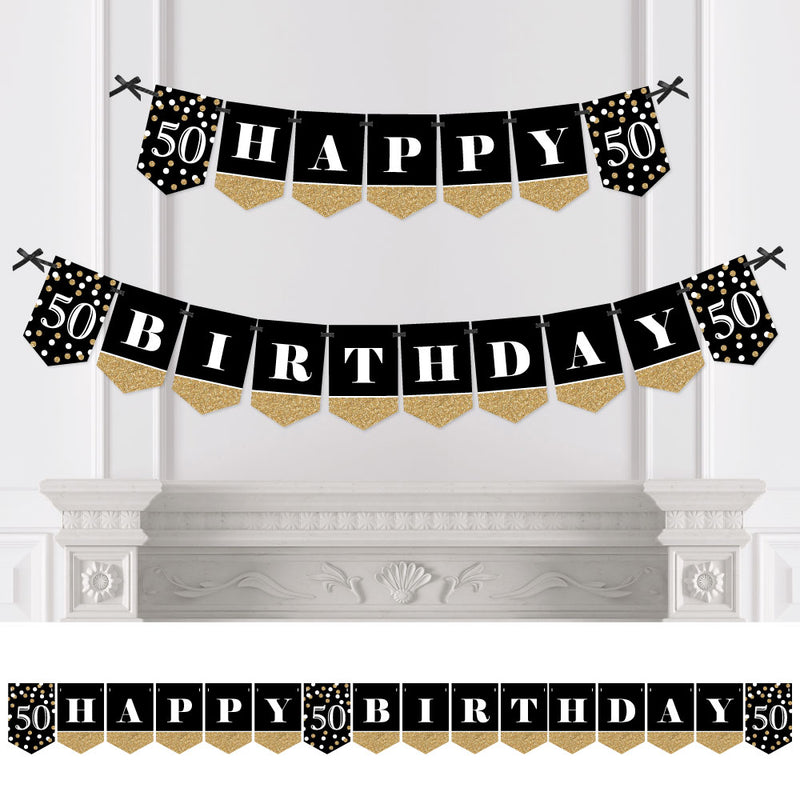 An Adult 50th Birthday - Gold Bunting Banner is an easy way to decorate for your celebration and bring your Birthday Party theme to life. Each themed bunting banner includes themed pennants and lettered pennants. Quickly assemble your bunting banner with the included ribbon - decorating for a birthday party has never been easier!