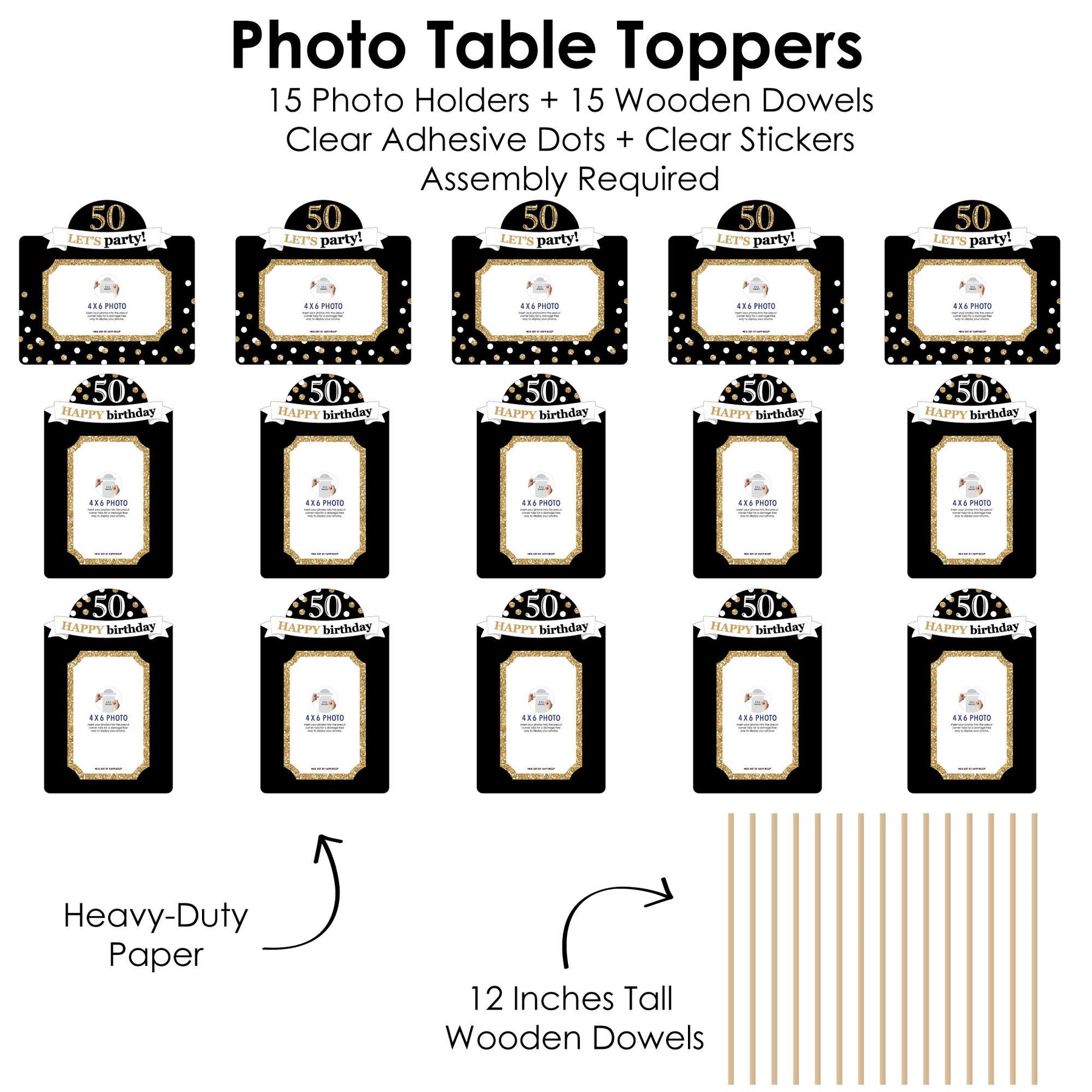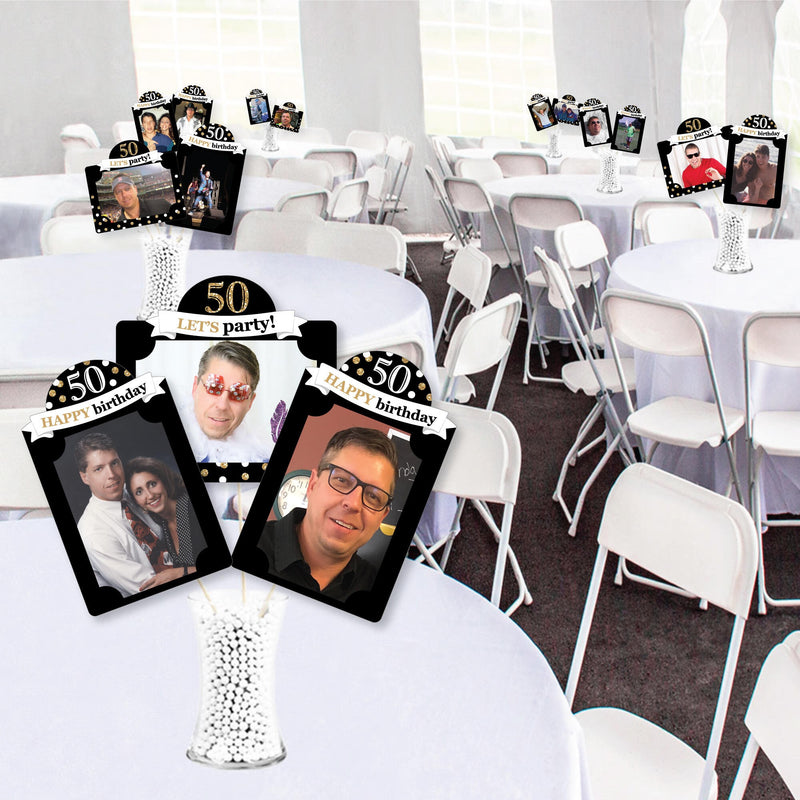 Create picture-perfect centerpieces for your birthday party with Adult 50th Birthday - Gold Photo Table Toppers. Photo Table Toppers is a set of 15 heavy-duty cardstock paper photo holder pieces, 15 Sticks, and includes clear assembly stickers for DIY required assembly. Each photo holder has 4 pre-cut slits to tab your own 4x6 photo – 10 vertical photo holders and 5 horizontal photo holders. (Note: Your photo will tab through back design of photo holder.) Adult 50th Birthday - Gold Photo Table Topper decorations can be used as centerpieces when attached to the included sticks and inserted into vases or floral arrangements. They easily accent your birthday party candy buffet when you add them to apothecary jars. Photo Table Toppers are a great addition to any birthday party and a fun way to proudly show off the guest of honor.