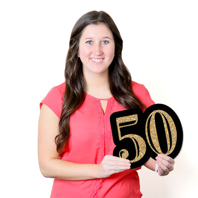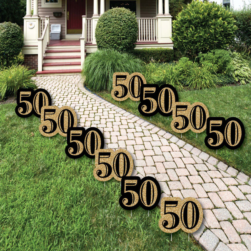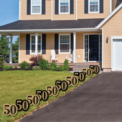 An impressive Adult 50th Birthday yard sign is sure to delight your guests and surprise everyone. This 10-piece set of Adult 50th Birthday - Gold lawn decorations is professionally printed with vivid colors to really make a statement wherever it is used. Each shaped outdoor sign comes with two stakes, making it easy to display on lawns, driveways or courtyards. Best of all, Adult 50th Birthday shapes are cut separately so you can arrange them any way you please. This decorative yard sign is made of waterproof plastic and is weather resistant, perfect for short-term display but can be used again and again with proper care.