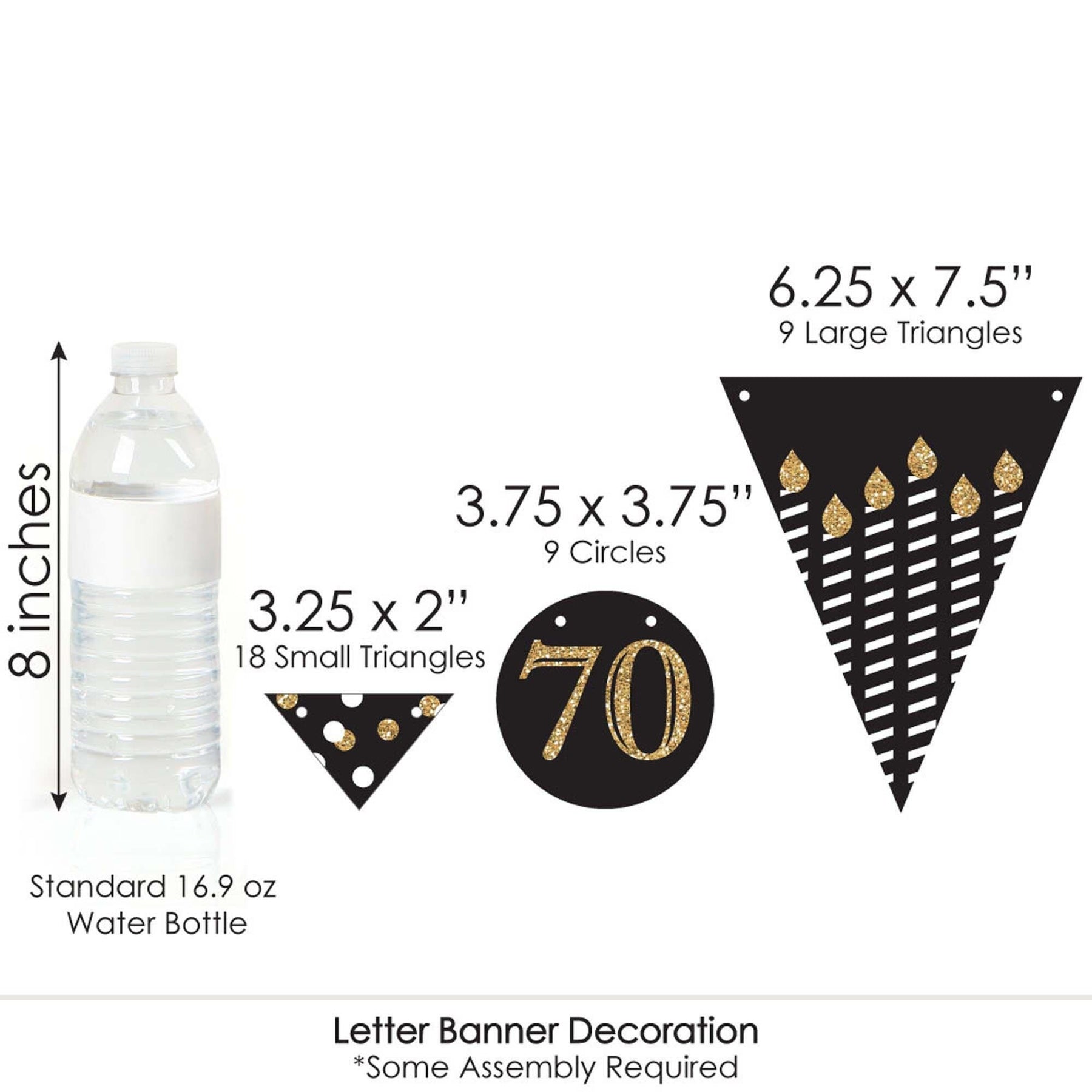 Greet your party guests and the Guest of Honor with an impressive Happy Birthday banner. Adult 70th Birthday - Gold - Birthday Party Letter Banner Decoration is an eye-catching way to decorate for any birthday. The variety of pennant designs and shapes paired with the Happy Birthday script letters will look great at any venue. Simply string the script letters onto the included cording and then add the pennant shapes in any order you wish. Hang as one large banner or cut into different lengths and display in multiple rows. Letter banner decorations are an easy-to-use party supply for your celebration.
