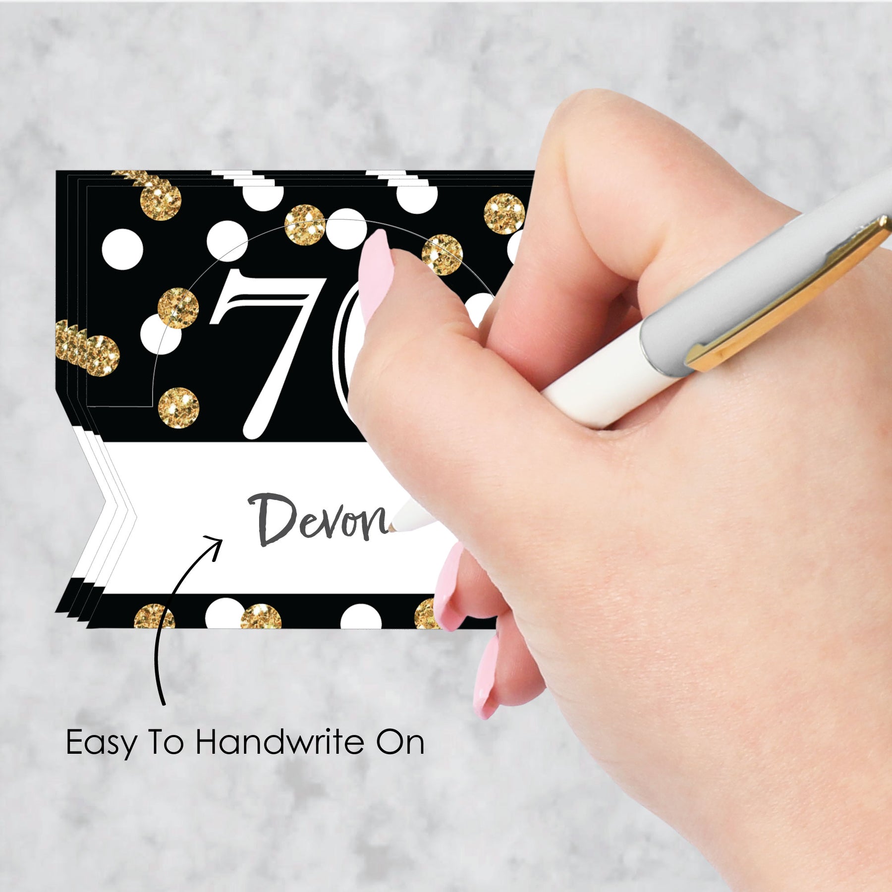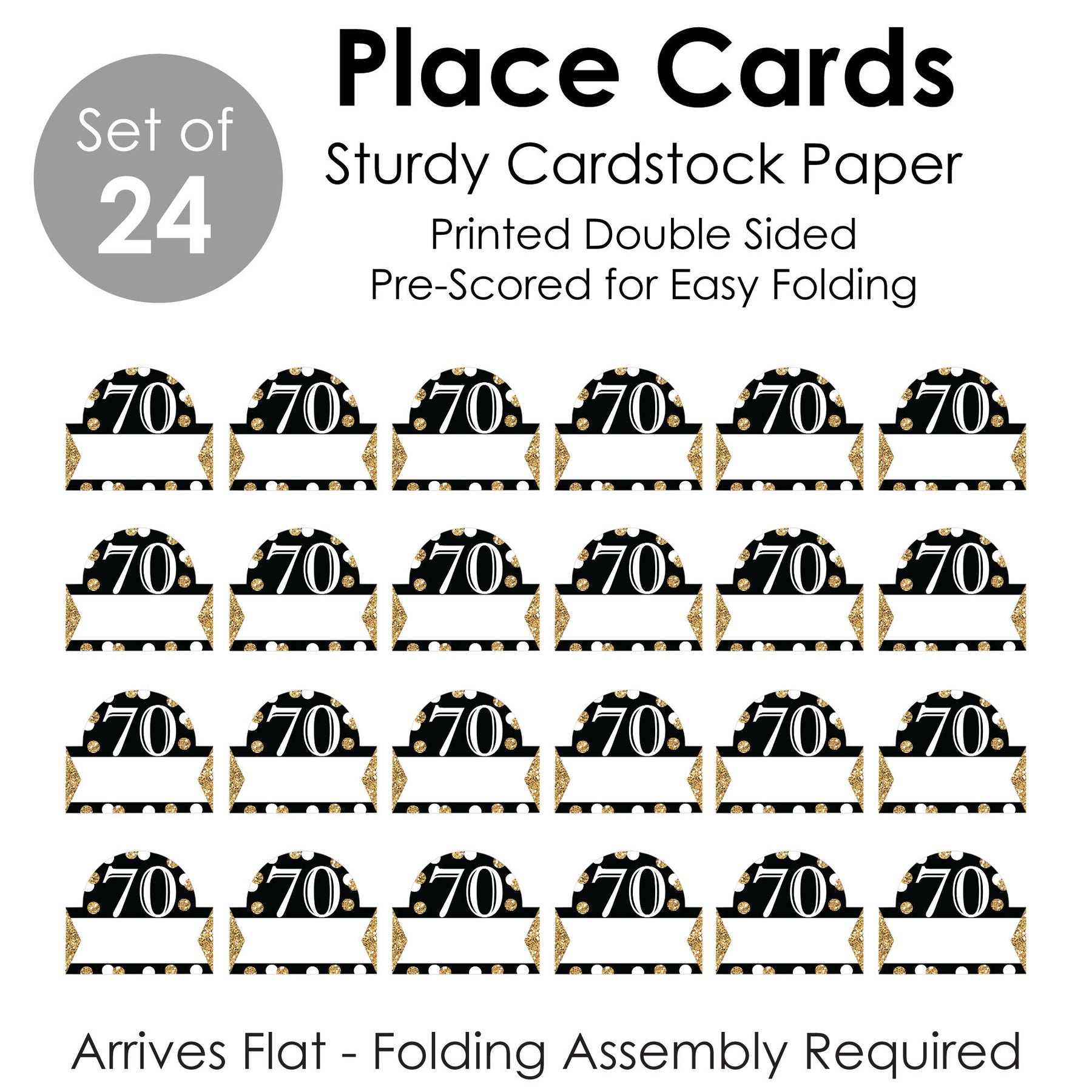 Level up your celebration by adding a special touch with the Adult 70th Birthday - Gold Place Cards. Coming in a set of 24, these place cards can be used in a variety of ways at your Birthday Party. Personalize them by writing your guests’ names on them, use them as table numbers at your venue, or display them at the buffet table as informational food tent cards. Lightweight and eye-catching, the Adult 70th Birthday - Gold Place Cards are professionally printed double-sided on sturdy cardstock paper with a photo-like shine. To assemble, write in the blank space area with a pen or marker. Then, push back the top outer edge, revealing the half-circle shape, and fold along the creased line. Great for banquets, reserved seating, table accents, and more, place cards measure to be 3.5 inches wide x 2.5 inches tall when fully assembled. Bring your celebration to life with the Adult 70th Birthday - Gold Place Cards!