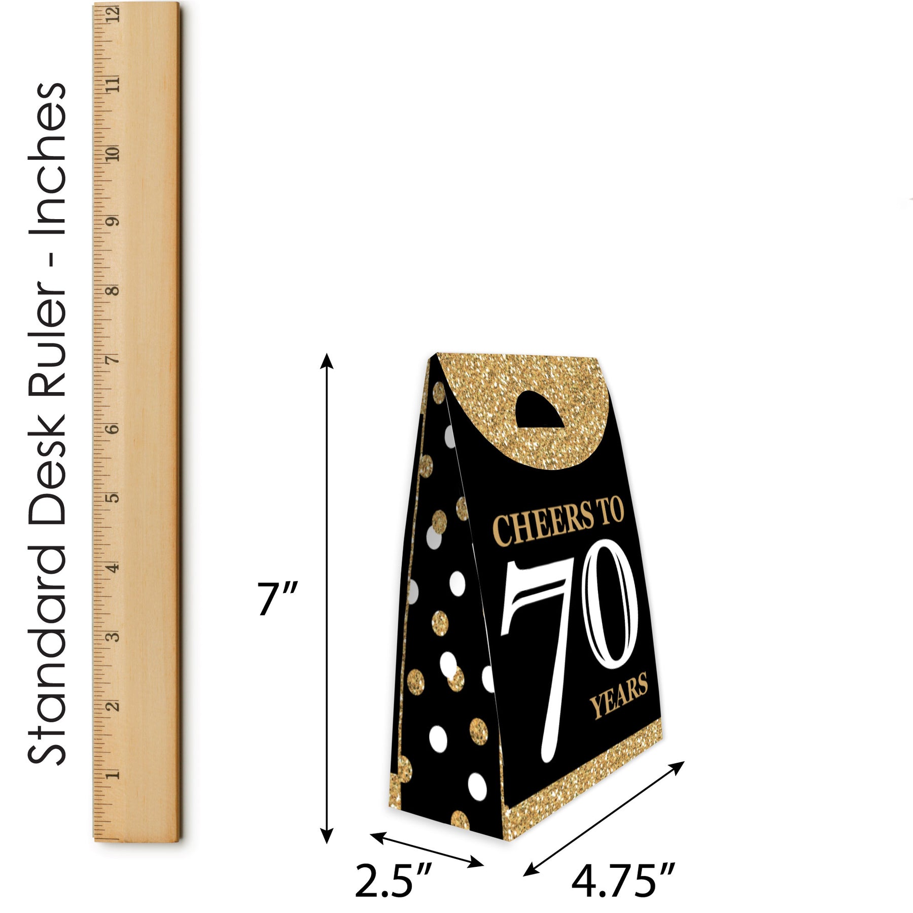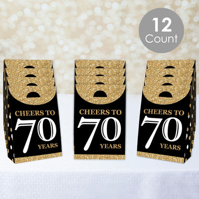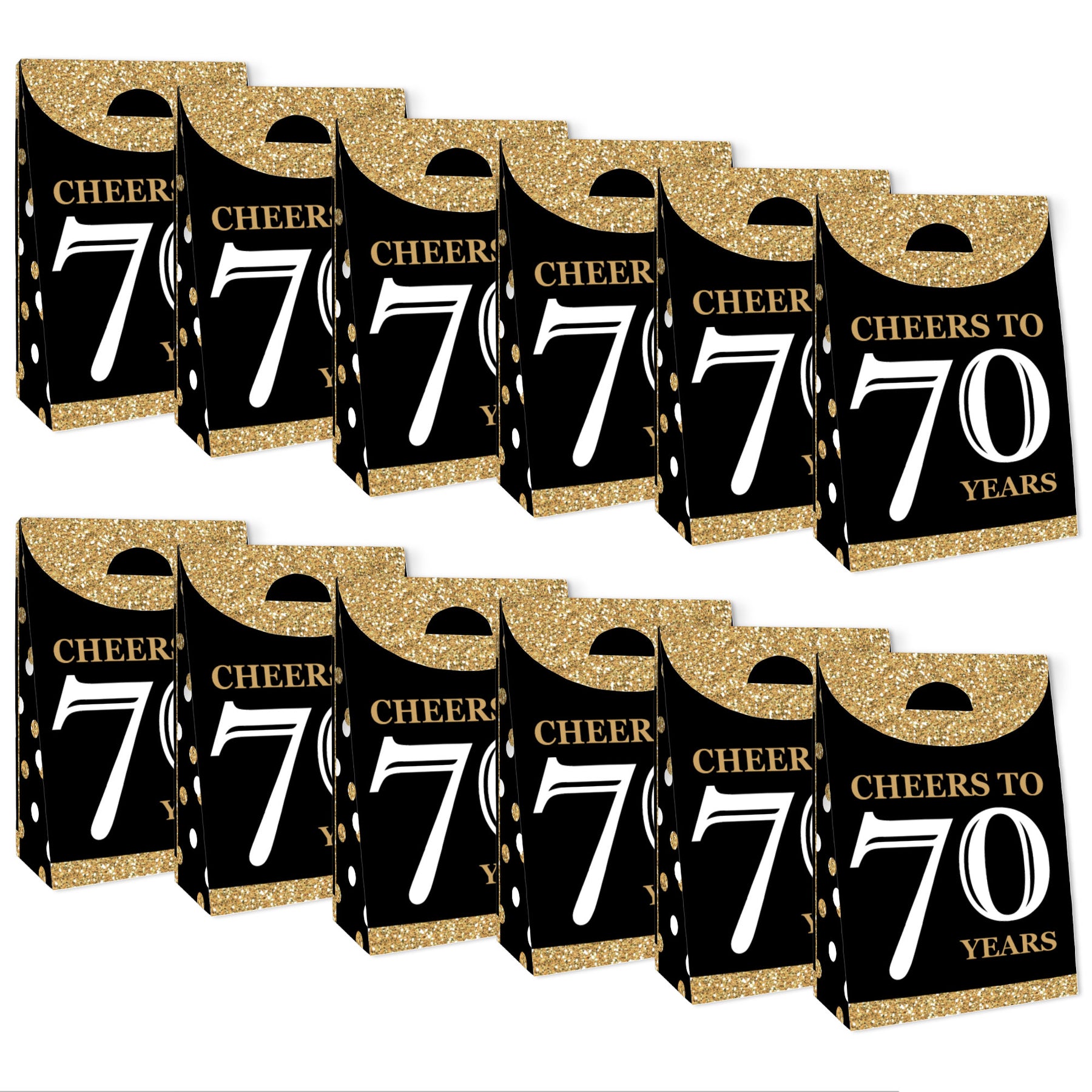 From small treats to trinkets and gifts, thrill your guests with the Adult 70th Birthday - Gold Party Goodie Bags! Ideal for your Birthday Party, these party loot bags measure to be 4.75” long x 2.5” wide x 7” tall and will certainly be a delight at your celebration. The Adult 70th Birthday - Gold party bags come in a set of 12 and are professionally printed double-sided on sturdy cardstock paper with some easy DIY assembly required. Each favor bag includes creased lines and numbered tabs for easy folding. To close the bag, fold over the top flap and insert the tab inside the slit to secure it shut. Packaging will also include assembly instructions. Fill these swag bags with small surprises inside and place them at your dessert table for guests to grab and take home. Make your celebration complete when you delight your guests with the Adult 70th Birthday - Gold Party Goodie Bags.