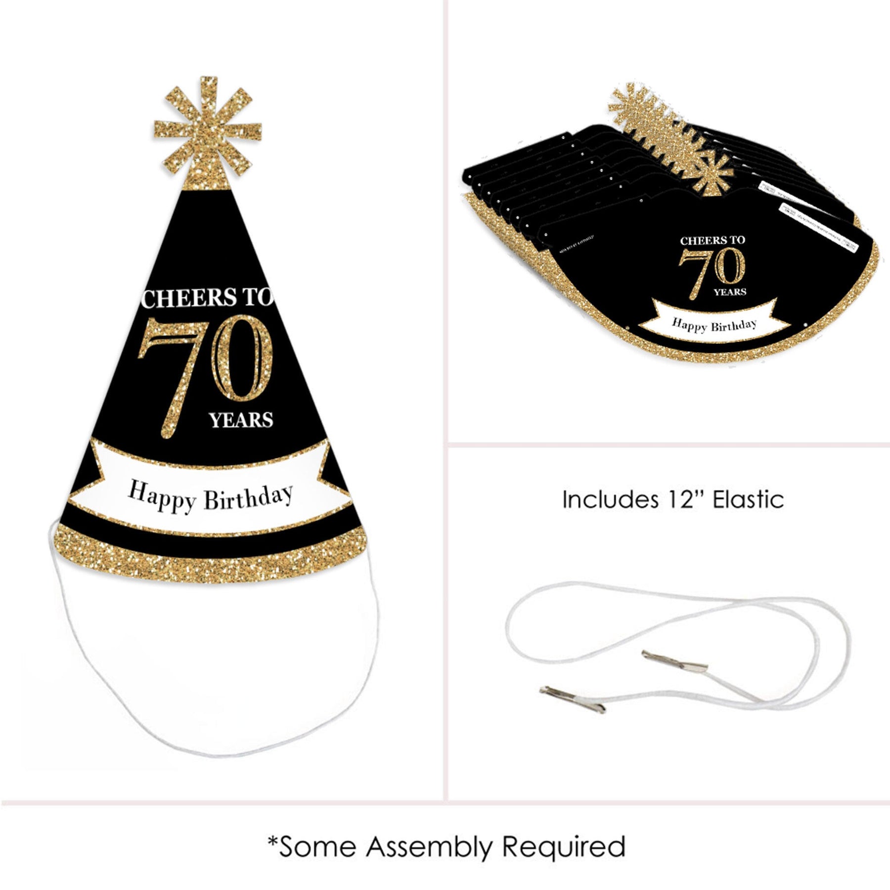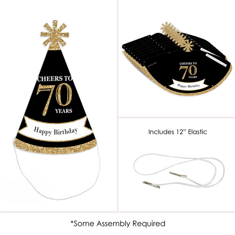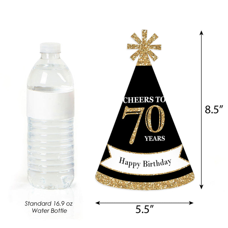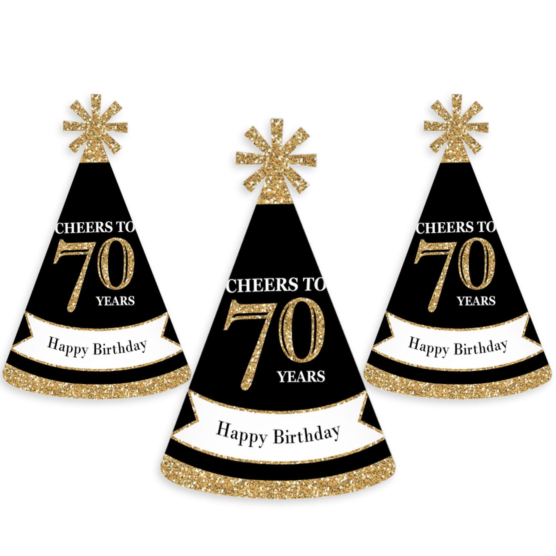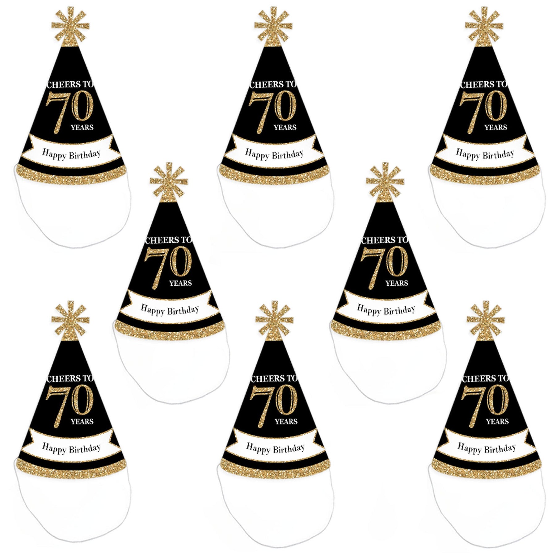 Everyone will be excited to celebrate when they see these Adult 70th Birthday - Gold birthday party hats. This set of 8 party hats is a great addition to your Adult 70th Birthday - Gold party and is sure to get everyone laughing! Adult 70th Birthday - Gold Hats have a festive star at the top. Be sure to have your camera ready because these Adult 70th Birthday - Gold birthday party hats are going to give you some great photos!