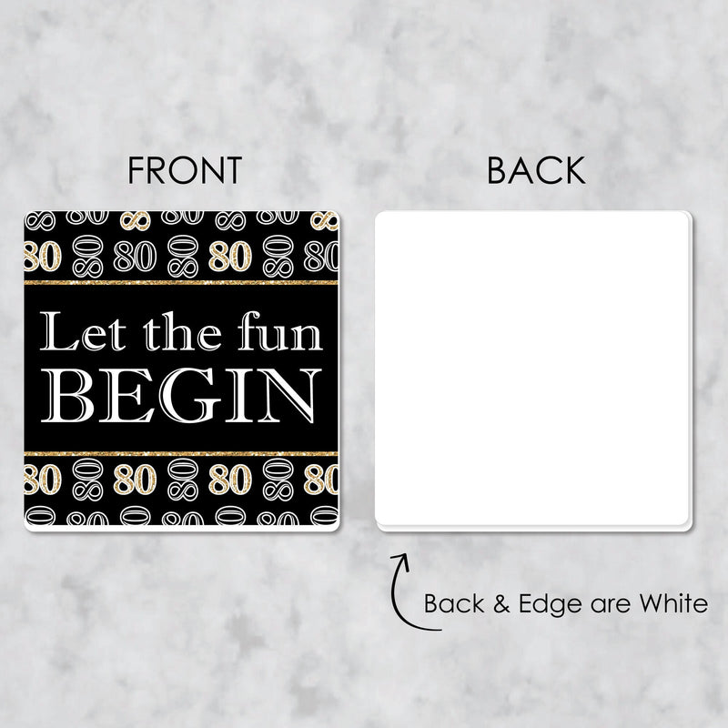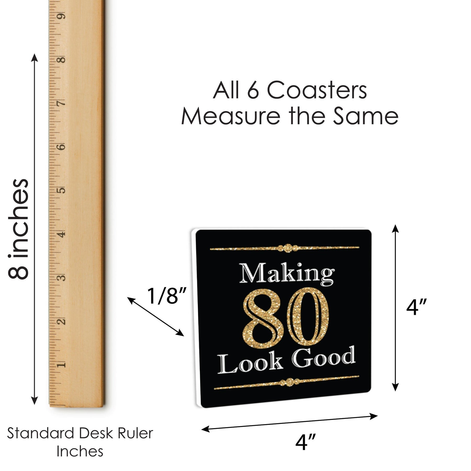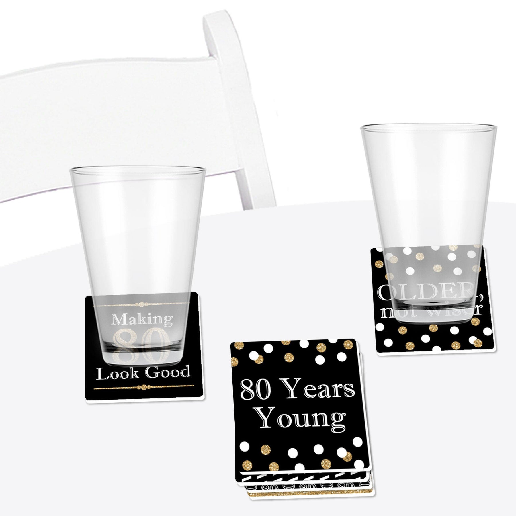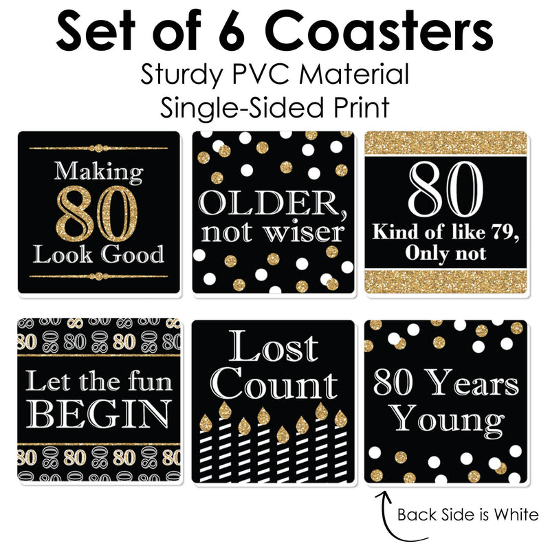 Whether a cocktail party or casual dinner, Adult 80th Birthday - Gold Funny Drink Coasters will be an instant favorite for both the birthday party host and party guests. This set of 6 Coasters is professionally printed one-sided on sturdy PVC material to help protect your table from drips, spills, and condensation. Adult 80th Birthday - Gold Coasters are great for most glasses and mugs and can be used for hot or cold drinks. This Drink Coaster Set is easy to clean, just use soap and water to wipe clean. Drink Coasters make for a perfect gift idea! With different eye-catching designs, guests can use an Adult 80th Birthday - Gold Coaster as a drink marker and then take home as a fun party favor. Gift the full set of Coasters as a unique housewarming present or birthday gift to a loved one with a sense of humor.