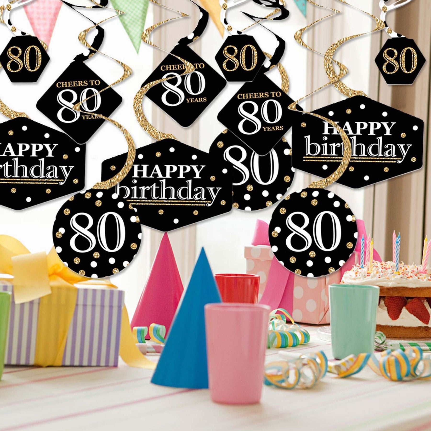 Take your Birthday Party to the next level when you add Adult 80th Birthday - Gold Party Decoration Swirls. Professionally printed and double-sided on heavy-duty cardstock paper, this hanging decor is a set of 40 (10 count per shape) that hang below an accordion-style spiral with included clear hooks. Each decoration swirl in the 40-piece set has a pre-cut hole for easy assembly using the included clear hooks. Party Decoration Swirls will arrive flat. Take a clear hook and insert the bottom bar into the pre-cut hole. Once the clear hook is fastened, gently stretch the swirl and hang it up. Add a pop of color when displayed over the gift table or dessert buffet. Or add your own string if you would like them to hang lower in your party space.