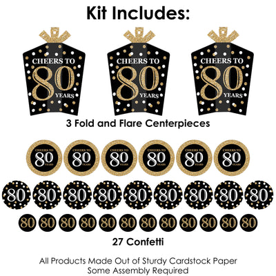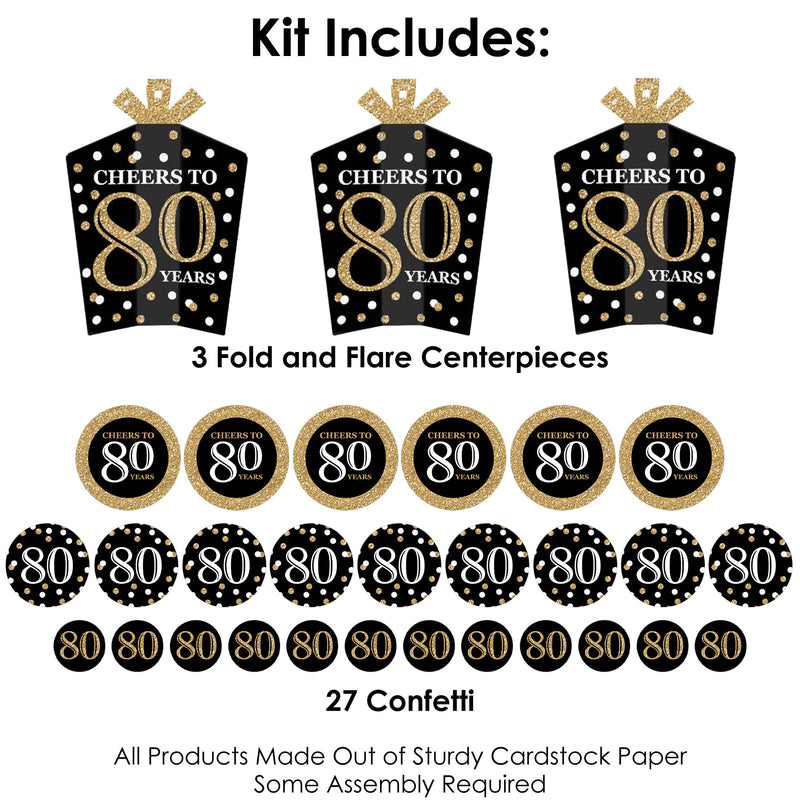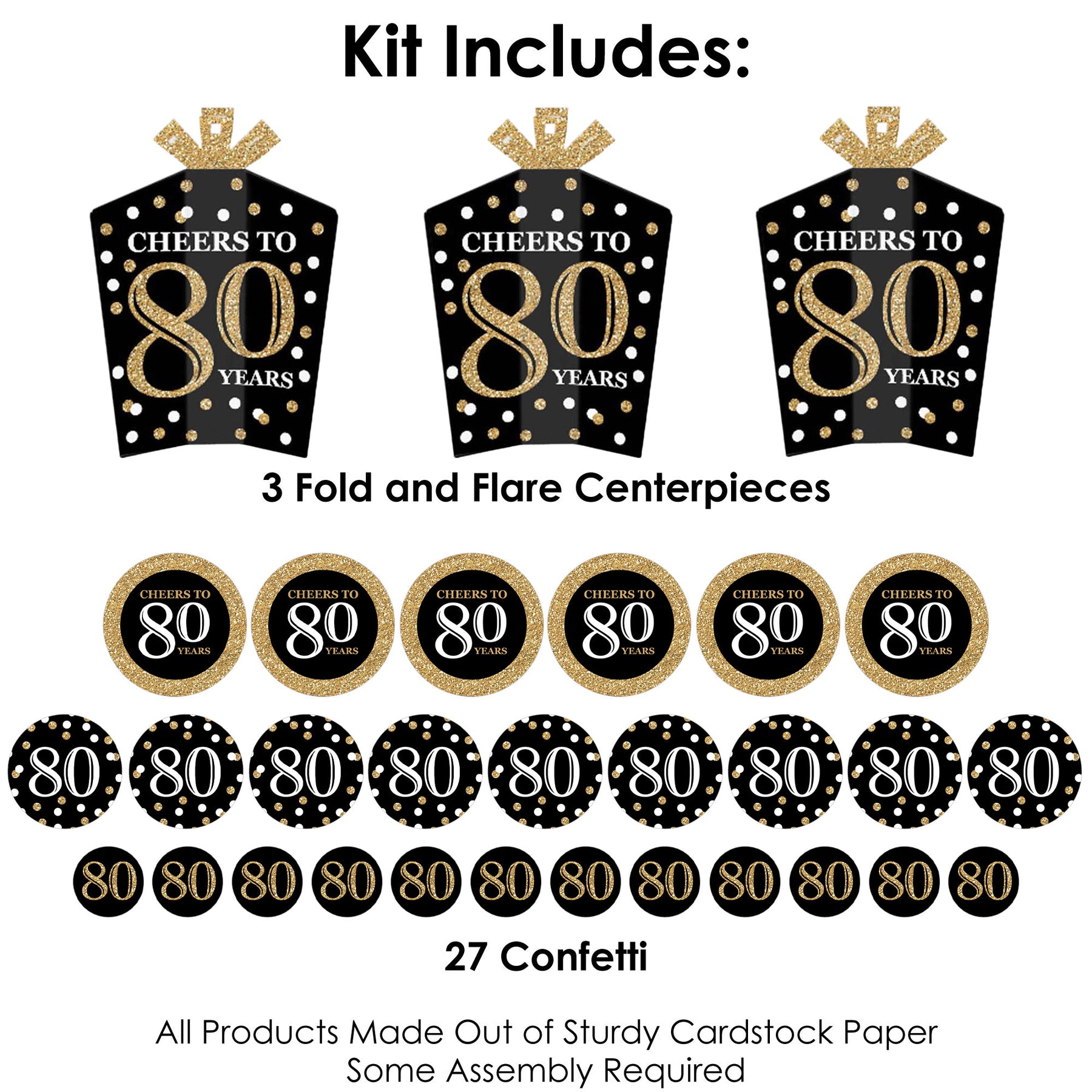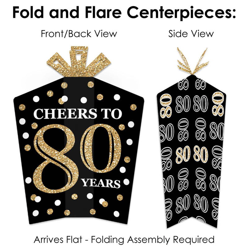 Create an iconic look at your Birthday Party with the Adult 80th Birthday - Gold Terrific Table Centerpiece Kit. Professionally printed double-sided on sturdy cardstock paper, each kit comes with 27 large confetti pieces and 3 fold and flare centerpiece decorations. To use, start out with the easy DIY fold and flare centerpieces by simply folding along the scored creases. Flare out the sides, which will allow the centerpiece to balance on its own and stand upright. Next, arrange the perfectly coordinated Adult 80th Birthday - Gold large confetti that can be scattered along the table. Perfect for small get-togethers and large banquets, the Adult 80th Birthday - Gold centerpiece kit will look great on party guests’ tables, dessert tables, and buffet tables. The starburst top of the fold and flare centerpiece will certainly draw attention, and the confetti will create a dynamic look with its variety in sizes. Take your table decorating to the next level when you use the Adult 80th Birthday - Gold Terrific Table Centerpiece Kit at your celebration.