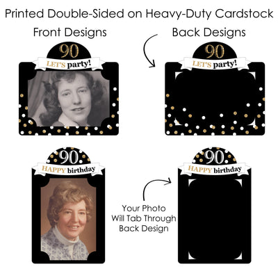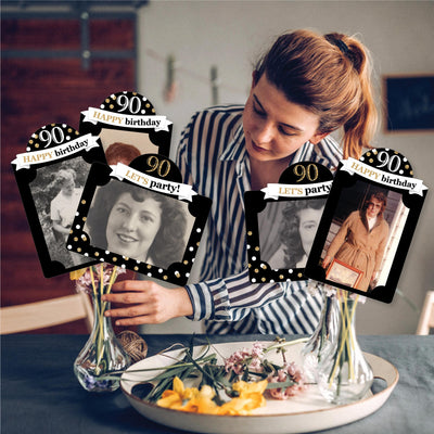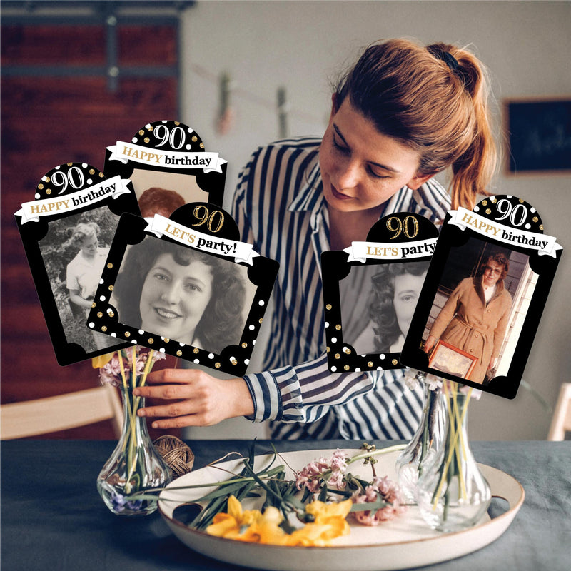 Create picture-perfect centerpieces for your birthday party with Adult 90th Birthday - Gold Photo Table Toppers. Photo Table Toppers is a set of 15 heavy-duty cardstock paper photo holder pieces, 15 Sticks, and includes clear assembly stickers for DIY required assembly. Each photo holder has 4 pre-cut slits to tab your own 4x6 photo – 10 vertical photo holders and 5 horizontal photo holders. (Note: Your photo will tab through back design of photo holder.) Adult 90th Birthday - Gold Photo Table Topper decorations can be used as centerpieces when attached to the included sticks and inserted into vases or floral arrangements. They easily accent your birthday party candy buffet when you add them to apothecary jars. Photo Table Toppers are a great addition to any birthday party and a fun way to proudly show off the guest of honor.