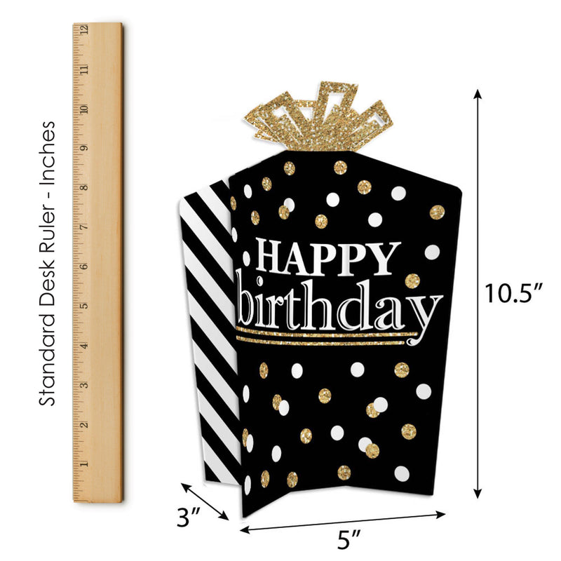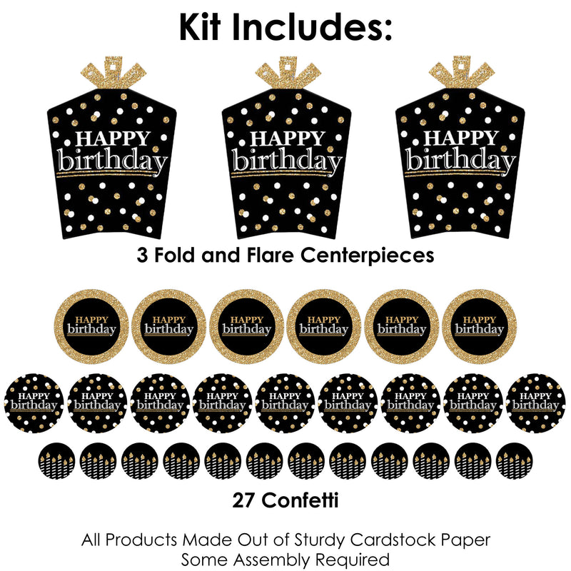 Create an iconic look at your Birthday Party with the Adult Happy Birthday - Gold Terrific Table Centerpiece Kit. Professionally printed double-sided on sturdy cardstock paper, each kit comes with 27 large confetti pieces and 3 fold and flare centerpiece decorations. To use, start out with the easy DIY fold and flare centerpieces by simply folding along the scored creases. Flare out the sides, which will allow the centerpiece to balance on its own and stand upright. Next, arrange the perfectly coordinated Adult Happy Birthday - Gold large confetti that can be scattered along the table. Perfect for small get-togethers and large banquets, the Adult Happy Birthday - Gold centerpiece kit will look great on party guests’ tables, dessert tables, and buffet tables. The starburst top of the fold and flare centerpiece will certainly draw attention, and the confetti will create a dynamic look with its variety in sizes. Take your table decorating to the next level when you use the Adult Happy Birthday - Gold Terrific Table Centerpiece Kit at your celebration.