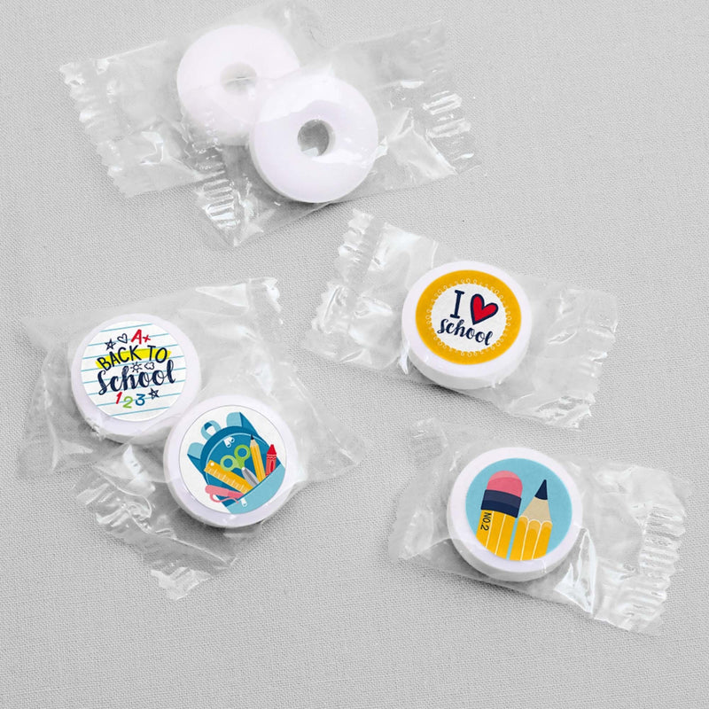 Give your classroom students a Back to School themed Hershey's® Kisses® party favor to enjoy during the First Day of School or take home and enjoy later. This set of Back to School Hershey's® Kisses® stickers are a fun way to add a little flair to all areas of your event. Simply peel and stick each label to the bottom of a chocolate Kisses® candy, LifeSavers® candy or any other similar-sized round candy. Use your decorated candies scattered down your classroom tables or in party favor bags for your students to take home. Each set of 108 stickers comes with 4 coordinating designs that everyone will adore. Hershey's® Kisses® stickers are the party supply you have been looking for to add a little extra touch to your new school year celebration.